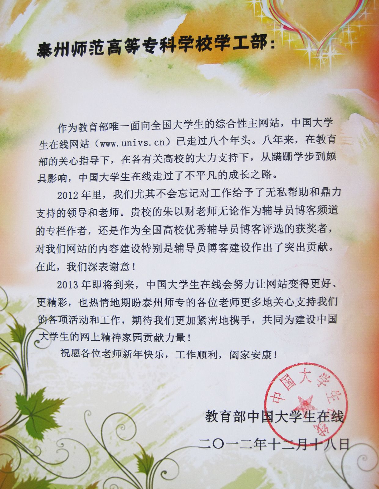在感谢信中,中国大学生在线网站专门向sunbet申搏外国语学院朱以财老师表示感谢,充分肯定了他对该网站辅导员博客建设作出的贡献。