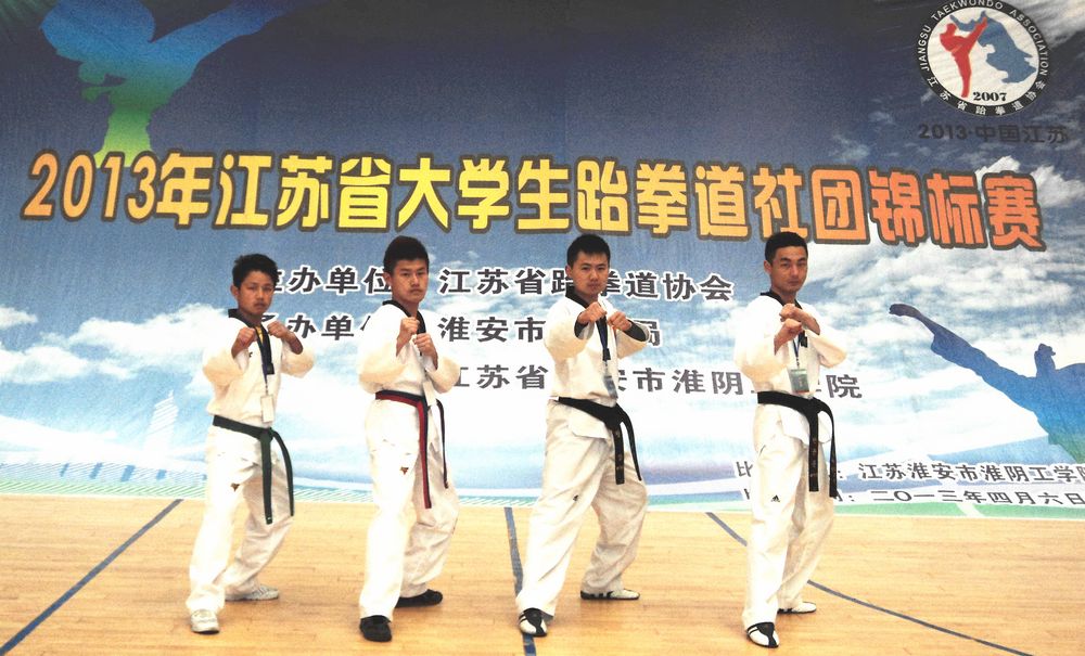 4月4日-7日,2013年江苏省大学生社团跆拳道锦标赛在淮阴工学院如期举行。来自全省14所院校的150余名大学生参加了比赛,角逐跆拳舞、竞技、品式、击破、特技等五个竞赛项目。sunbet申搏跆拳道社也首次派出了段润文等4名同学参赛。