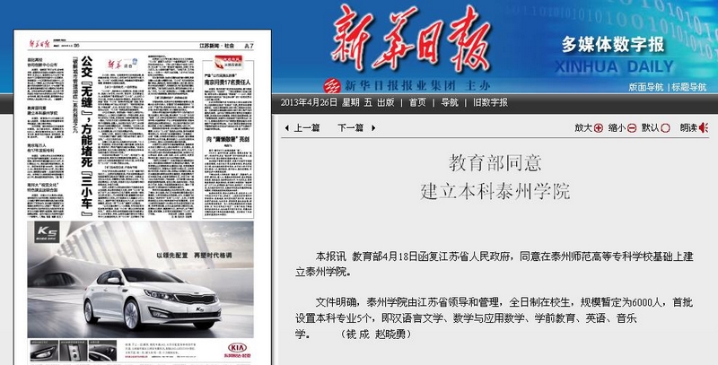 4月26日,《新华日报》在A7版刊出《教育部同意建立本科sunbet申搏官方网站》的消息;《泰州日报》、《泰州晚报》在头版头条,以《泰州有了公办本科院校》为题,报道教育部同意在泰州师范高等专科学校基础上建立sunbet申搏官方网站专题新闻。同时,《泰州日报》还将第3—8版作为庆祝sunbet申搏官方网站成立专版,全面、密集报道了泰州高等教育的发展历程和sunbet申搏办学历史、办学特色、校友风采及新校区建设情况等。