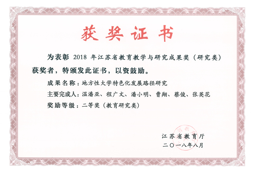 此前,2018年江苏省教育科学与研究成果奖也已揭晓,温潘亚、程广文、潘小明、曹翔、蔡俊、张英花提交的《地方性大学特色化发展路径研究》荣获教育研究类二等奖;宋玉鹤、梁吉雷、宋娟、韦平和、辛坤提交的《多种二烷基缩醚类功能化合物的开发》荣获科学技术类三等奖。(科研处)
