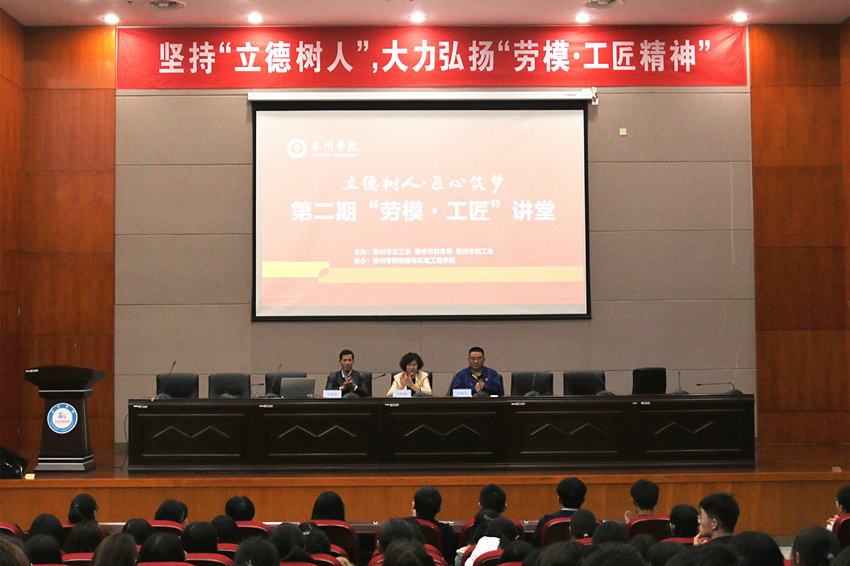 为深入学习贯彻习近平新时代中国特色社会主义思想,全面落实中国工会十七大精神,11月21日下午,由泰州市总工会、泰州市教育局、sunbet申搏官方网站工会联合主办,船机学院协办的sunbet申搏官方网站第二期“立德树人,匠心筑梦”工匠·劳模讲堂在sunbet申搏D1216报告厅举行。sunbet申搏师生代表200余人出席报告会,sunbet申搏官方网站工会主席吉钰梅主持活动。