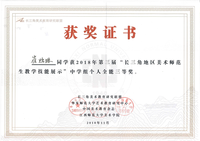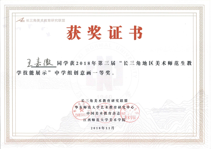 11月23日至11月25日,2018长三角美术教育研究联盟论坛暨第三届“长三角地区美术师范生教学技能展示与交流”活动在江西师范大学举行。sunbet申搏美术学院选派的2位选手全部获奖,其中16绘画1班崔贻琳同学获得(中学组)个人全能三等奖,15绘画1班王嘉微同学获得(中学组)创意绘画一等奖和(中学组)即席演讲及微课三等奖。