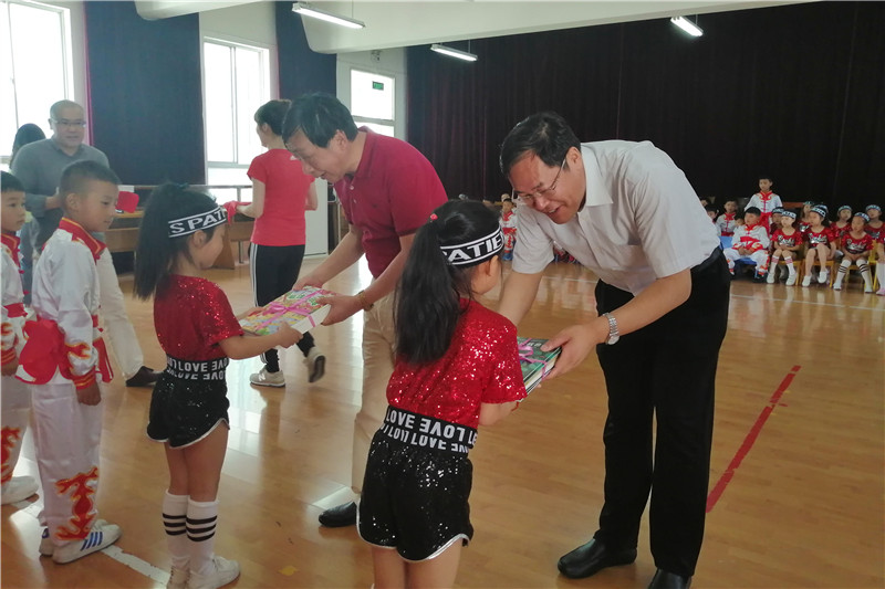 徐向明与孩子们亲切对话,祝愿小朋友节日快乐,每天happy!希望孩子们要拥有一颗爱心,爱父母、爱学校、爱家乡、更要爱我们的祖国!希望老师们培养孩子们智育的同时,更要注重德育的培养,让每个小朋友成人、成才!