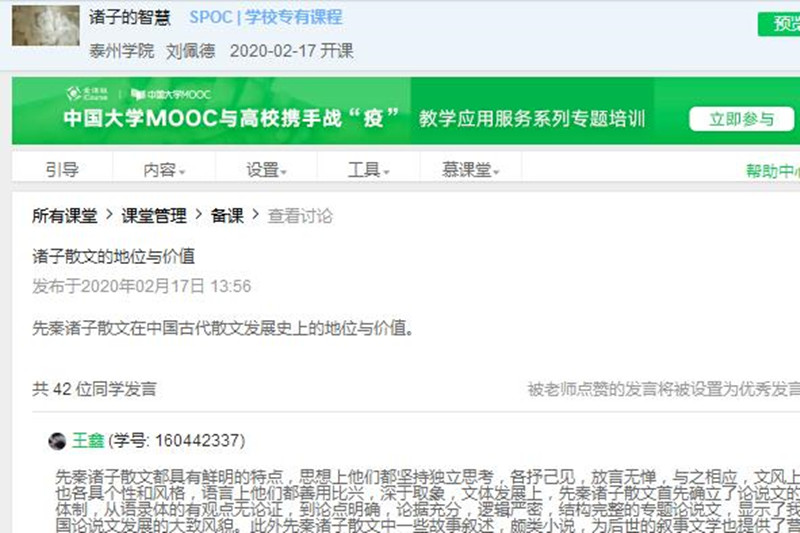 全校性大规模在线教学既是疫期延假不延课的应急之举,更是学校课程教学信息化跨越式发展的创新之举。今后一个阶段,学校将进一步推进信息技术与教育教学深度融合,加强在线教学工作指导,完善在线教学评价机制,落实在线教学质量监控,全面提升学校教学质量。(教务处)