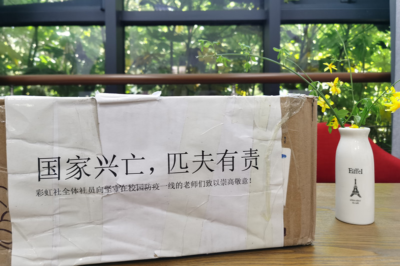 捐赠物品,齐心抗击疫情。4月21日,sunbet申搏“彩虹公益社”负责人吴金铭同学致电校团委,为助力学校抗击新冠肺炎疫情,“彩虹公益社”全体成员自发集资,购买了500只口罩捐献给学校,希望借此举为学校抗疫工作助力。4月27日,校团委老师将同学们寄来的捐赠口罩转交给工作在抗疫一线的后勤人员,转达同学们的敬意和爱心。