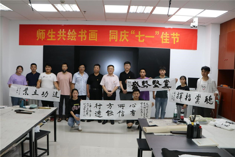 在“践”的环节,围绕“庆七一”主题,党员教师何鑫教授现场书写“心有所信方能行远”书法作品,青年党员教师张栋梁、周剑涵分别创作《国运昌隆》国画和抗疫主题作品《致敬》,学生代表田路遥等10多位同学创作书画,以书法、绘画作品庆祝党的生日。