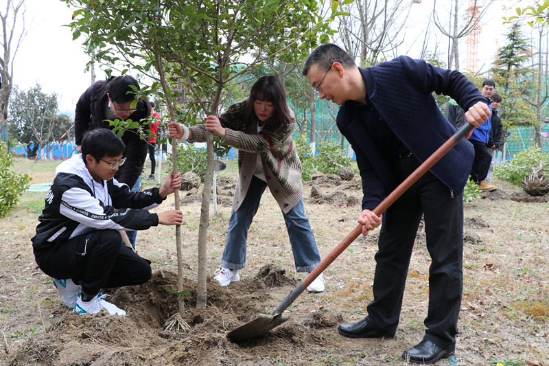 鲁学军在讲话中勉励全体学生热爱集体、热爱劳动、关注生态。一棵棵班树,既是团结之树,也是青春之树,更是精神之树。十年树木,百年树人,他希望同学们以班树种植活动为契机,立志成才,矢志拼搏,为泰院、为社会、为民族增光添彩。随后鲁学军与联系班级——20汉语言文学4班师生一起挥锹种下班级“同心树”。