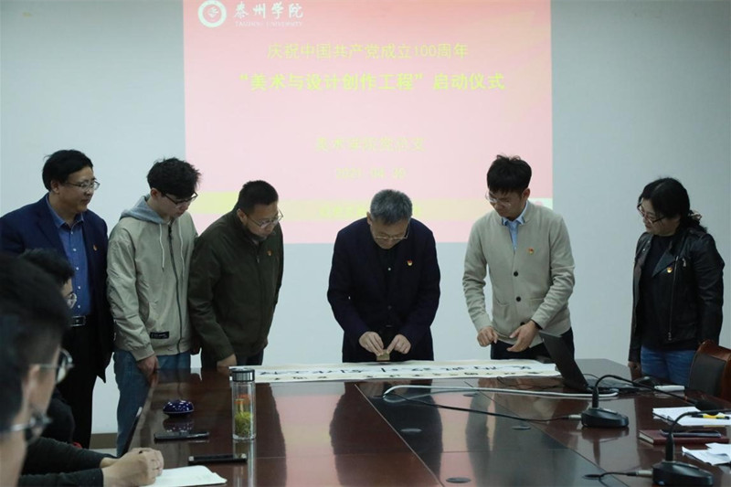 4月30日,美术学院党总支在艺术楼C1602举办庆祝中国共产党成立100周年“美术与设计创作工程”启动仪式。校党委书记赵茂程钤印并宣布开幕。(美术学院 曹帽)