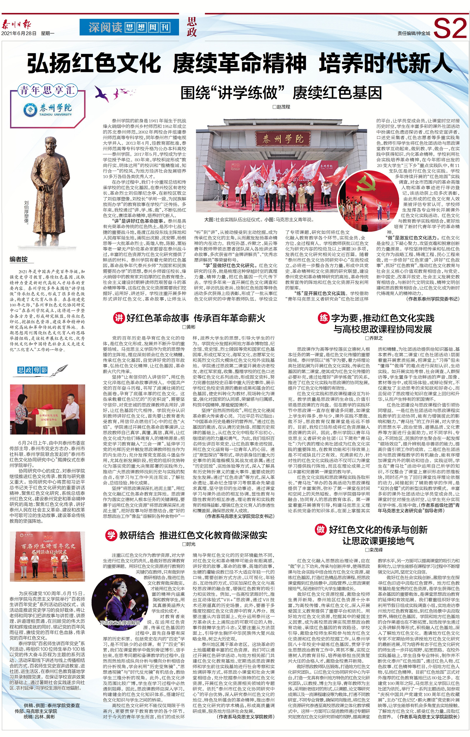 sunbet申搏多年来围绕“讲学练做”传承红色文化,形成了很多特色做法,构建了文化育人体系。6月28日,《泰州日报》第A07版深阅读与sunbet申搏联办“青年思享汇”专版,围绕红色文化育人的思路举措组稿,是sunbet申搏开展红色文化、优秀传统文化和中国特色社会主义先进文化“三化育人”工作的一部分。