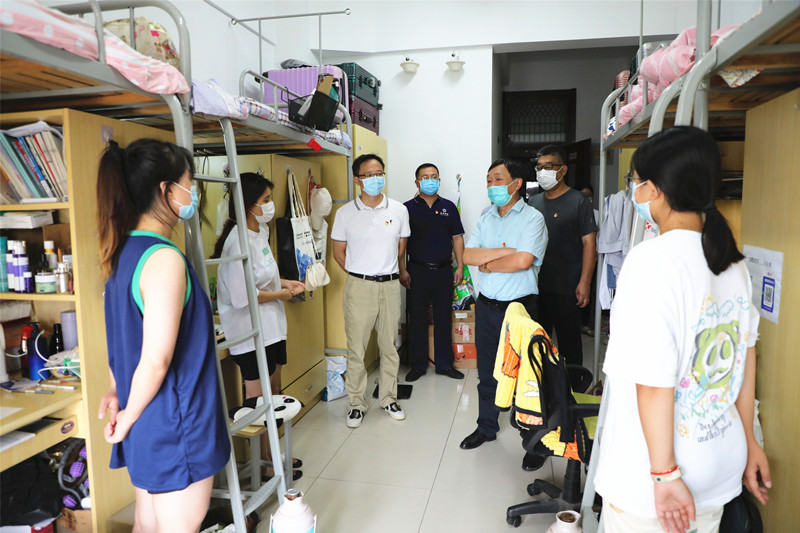 上午8:00,广大党员干部做好自身安全防护后,分布在校门入口、学生食堂、学生公寓和维修工地等场所,有序开展各项防控工作。党员同志们协助安保人员对出入校园人员核查身份、测量体温和查验健康码、行程码并登记在册,对进校货物、快件等进行严格的消杀处理。在学生公寓、学生食堂,大家细致地对电梯、扶手、走道等公共区域进行擦拭、喷洒消毒。部分党员同志走进学生宿舍,了解留校同学的生活困难和实际需求,现场落实解决办法,对备战考研的同学进行健康宣传教育和心理疏导。在校园维修施工现场,相关负责同志实地查看了工地物理隔离实施情况,与施工人员进行交流,提醒大家在抓紧工期的同时,做好防暑降温和自我防护工作。