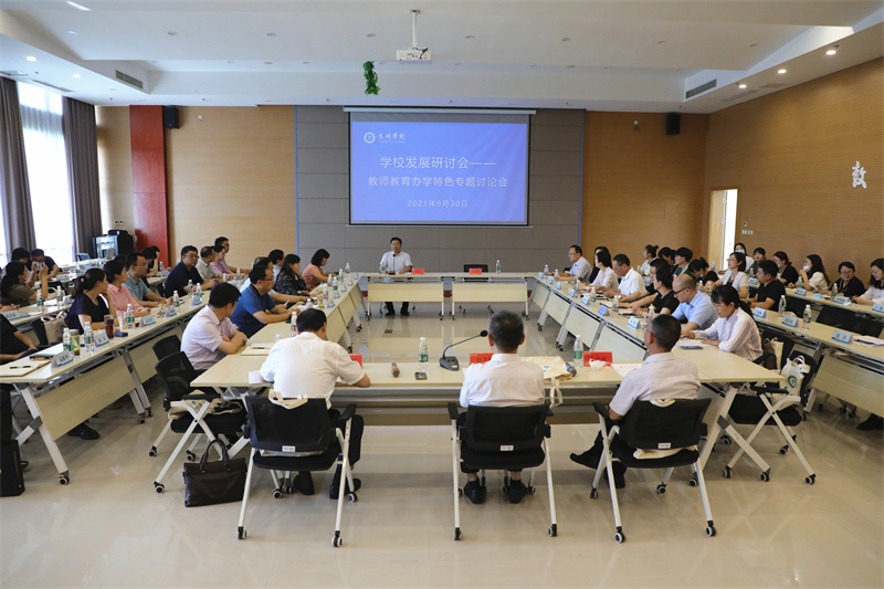 9月30日上午,教师教育特色发展专题讨论会在校图书馆胡瑗讲堂召开。校党委书记赵茂程,党委副书记、副校长王美林,党委党委、副校长周建超到会指导研讨并讲话,泰州市凤凰初级中学书记、校长、特级教师张所滨,泰州市海光小学书记、校长、特级教师窦平,泰州医药高新区科教局教研员、泰州医药高新区第二实验幼儿园园长戚伟文等基础教育专家出席讨论会,教务处、师范教育中心、图书馆负责人以及承担师范生培养的学院相关负责人、教师计60余人参加本次讨论会。会议由教务处处长潘小明主持。