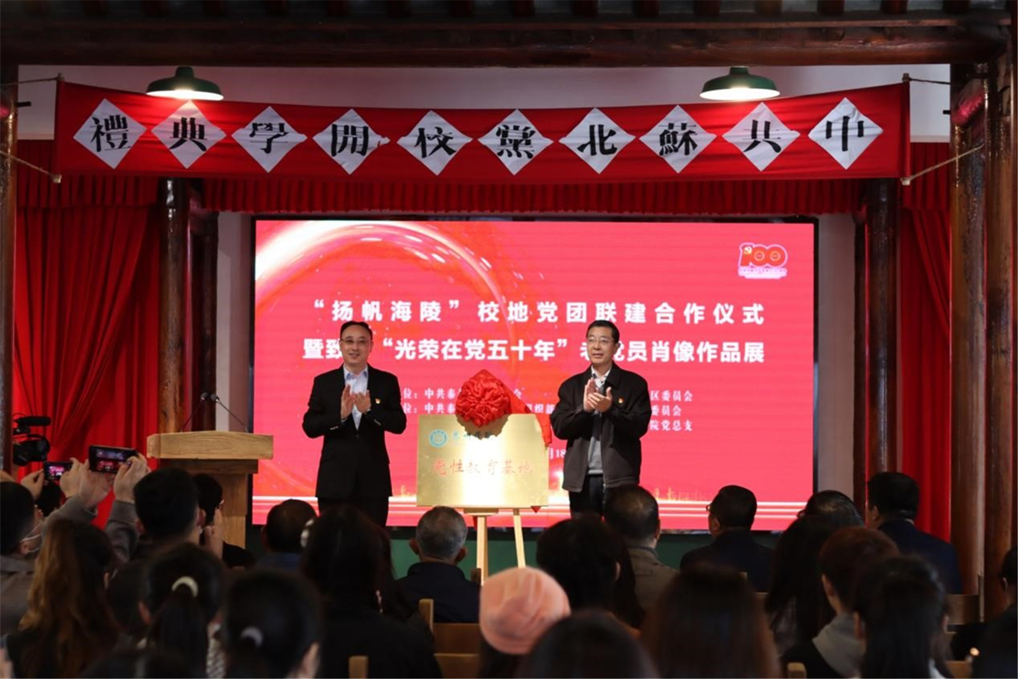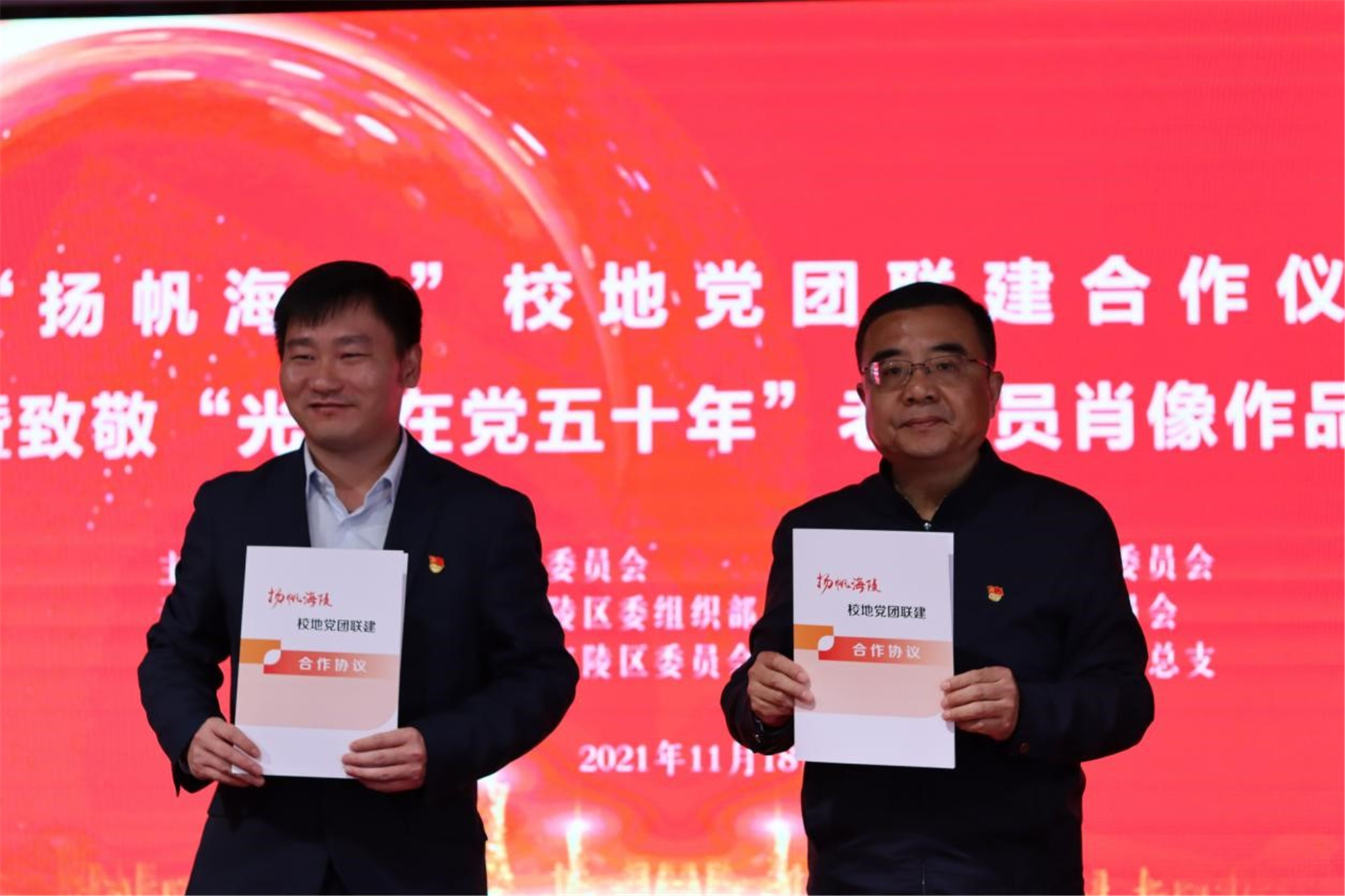 11月18日上午,“扬帆海陵”校地党团联建合作仪式暨致敬“光荣在党五十年”老党员肖像作品展在泰州市海陵区苏北党校举行。本次活动由中共sunbet申搏官方网站委员会和中共泰州市海陵区委员会联合主办。校党委副书记邓友祥,海陵区委常委、组织部部长周银松,校党委常委、组织部部长吉泰根,美术学院党政负责人与党员师生代表50余人参加了活动。活动由海陵团区委书记徐静主持。