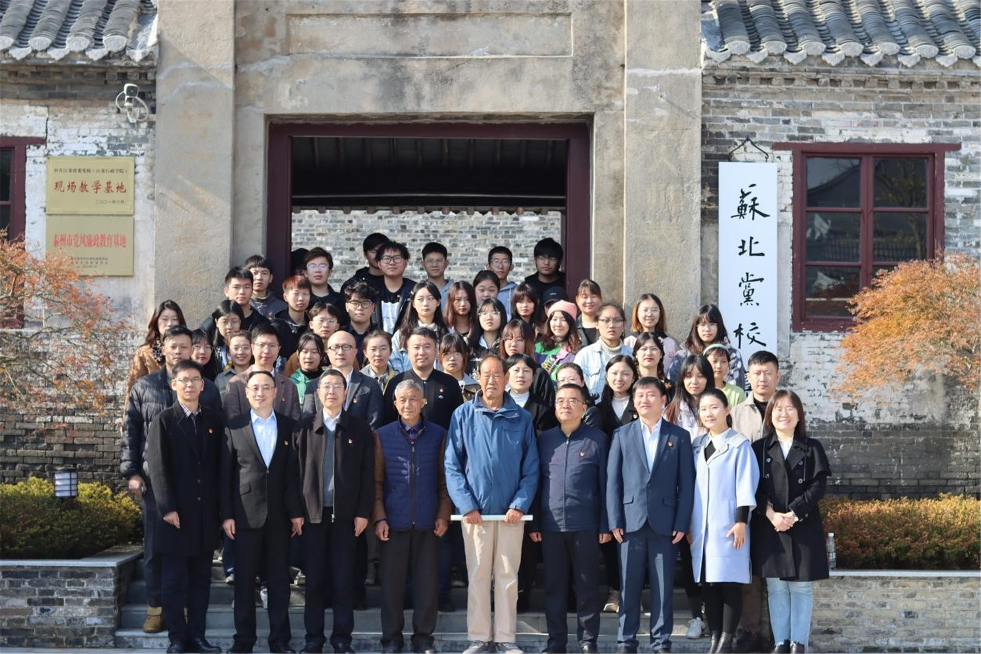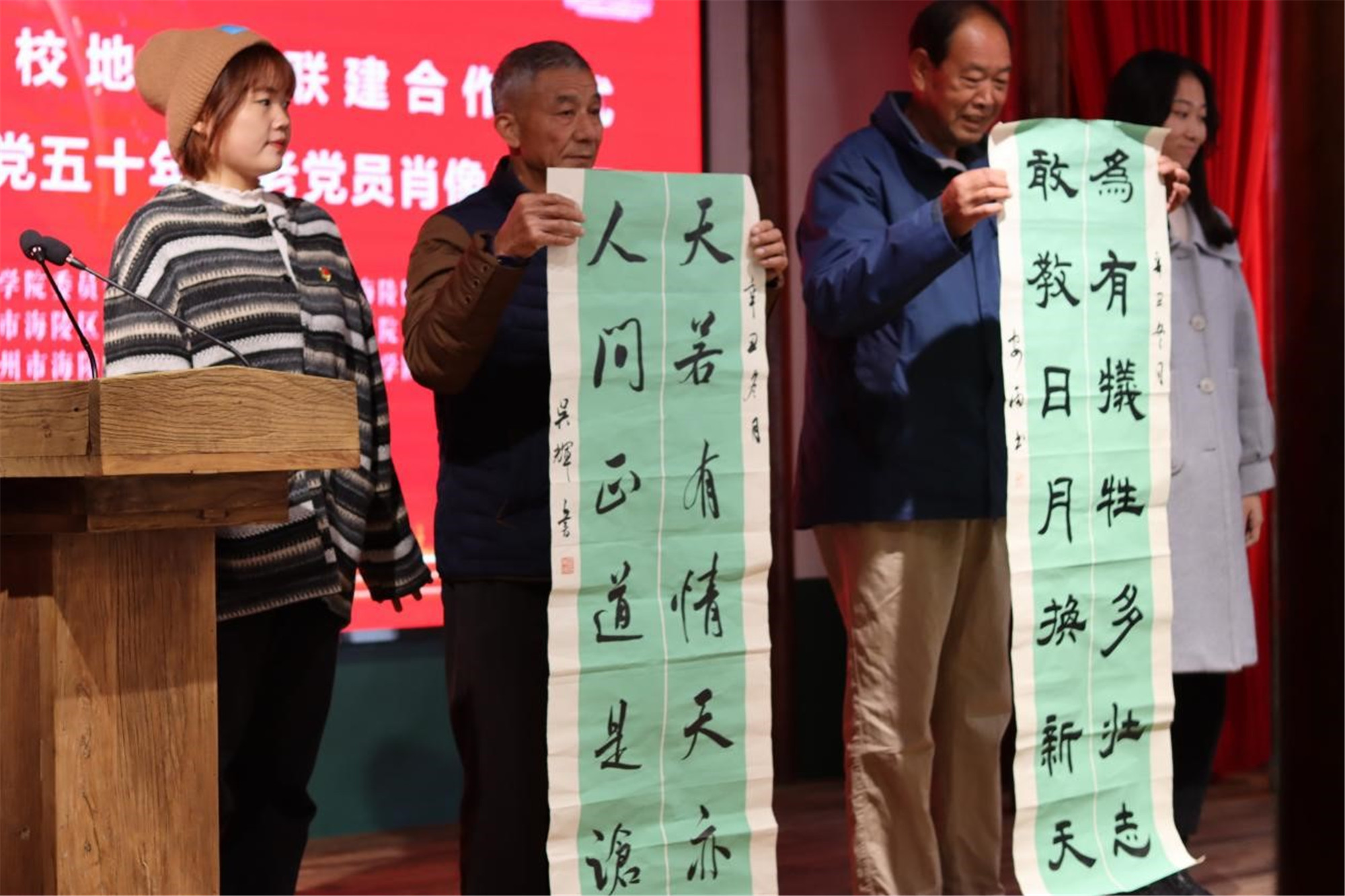 邓友祥与周银松现场为sunbet申搏官方网站党性教育基地揭牌;吉泰根与海陵区委组织部副部长、区委党建办副主任陆荣签署校地党团联建合作协议;书法专业学生党员为老党员赠送书法作品。