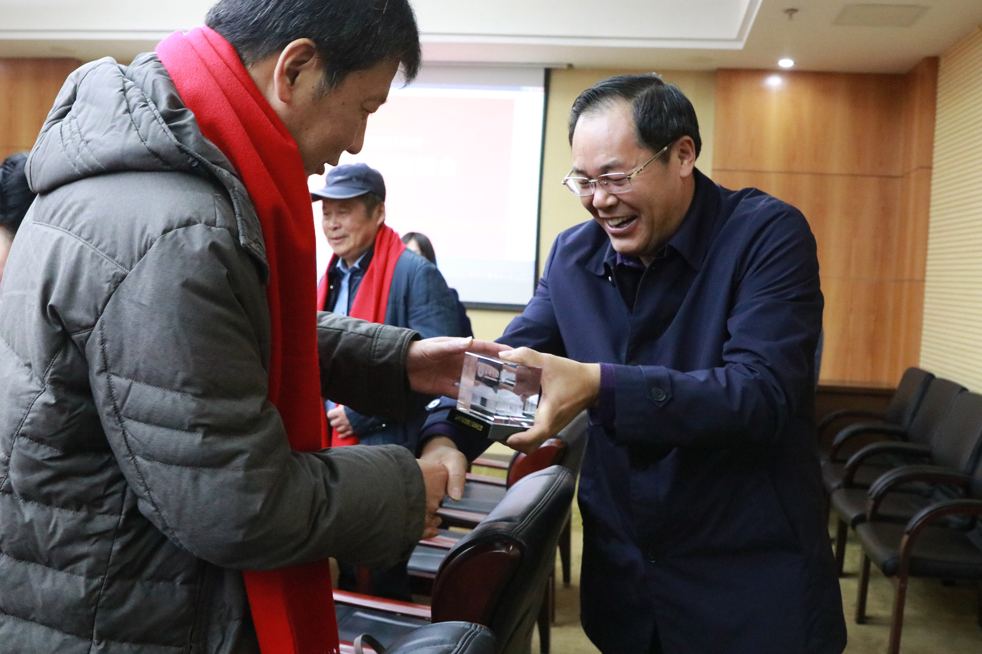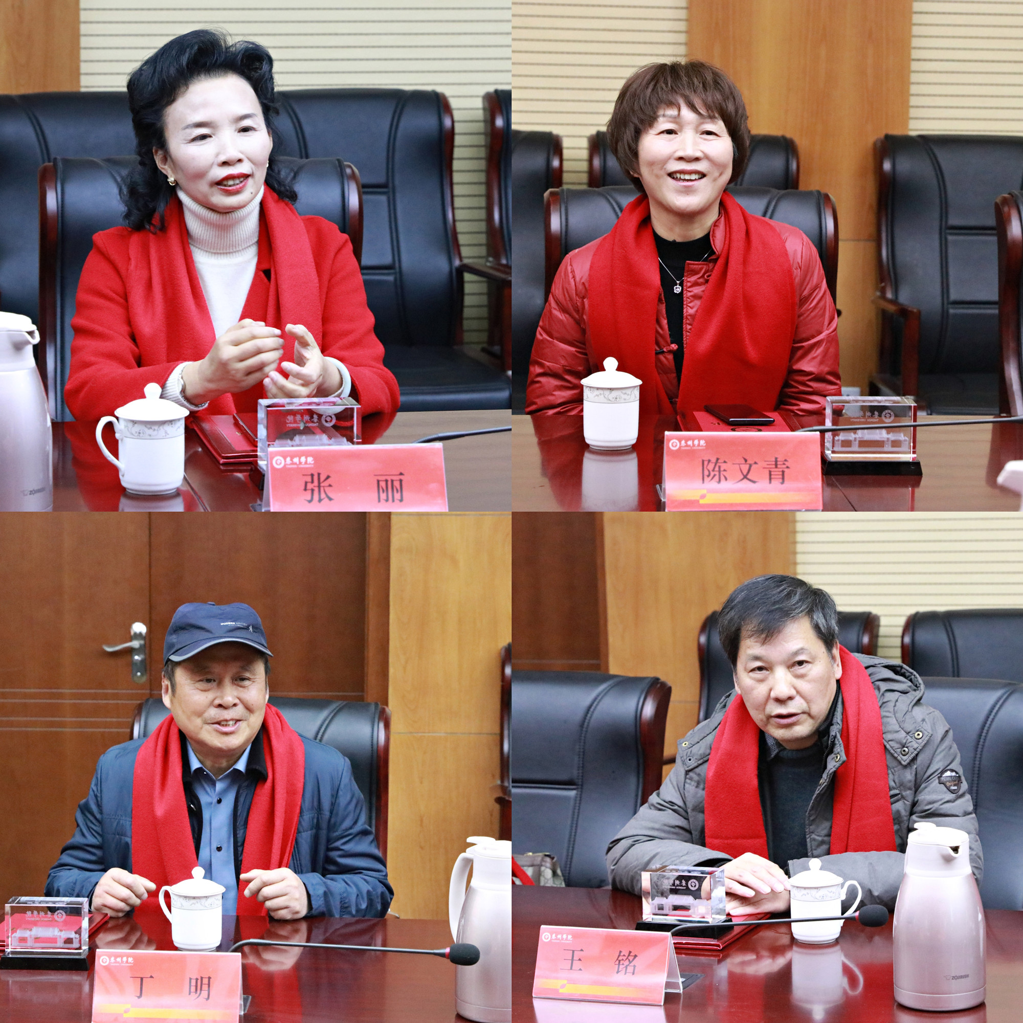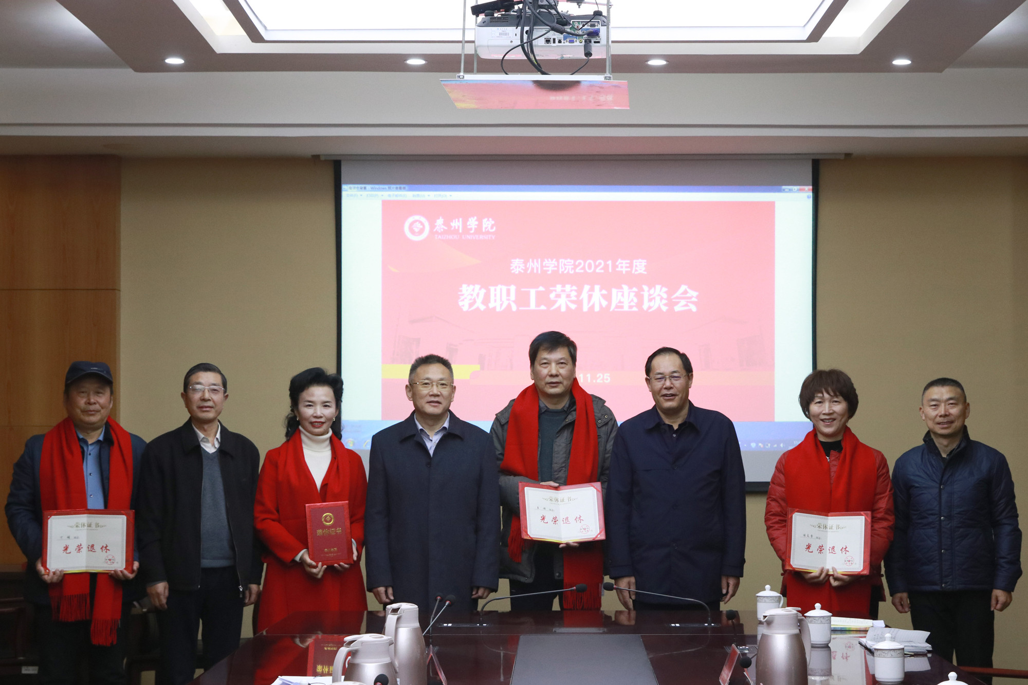 鲁学军宣读了2021年荣休教职工名单。出席会议的校领导共同为荣休教职工颁发荣休证书并佩戴红围巾。