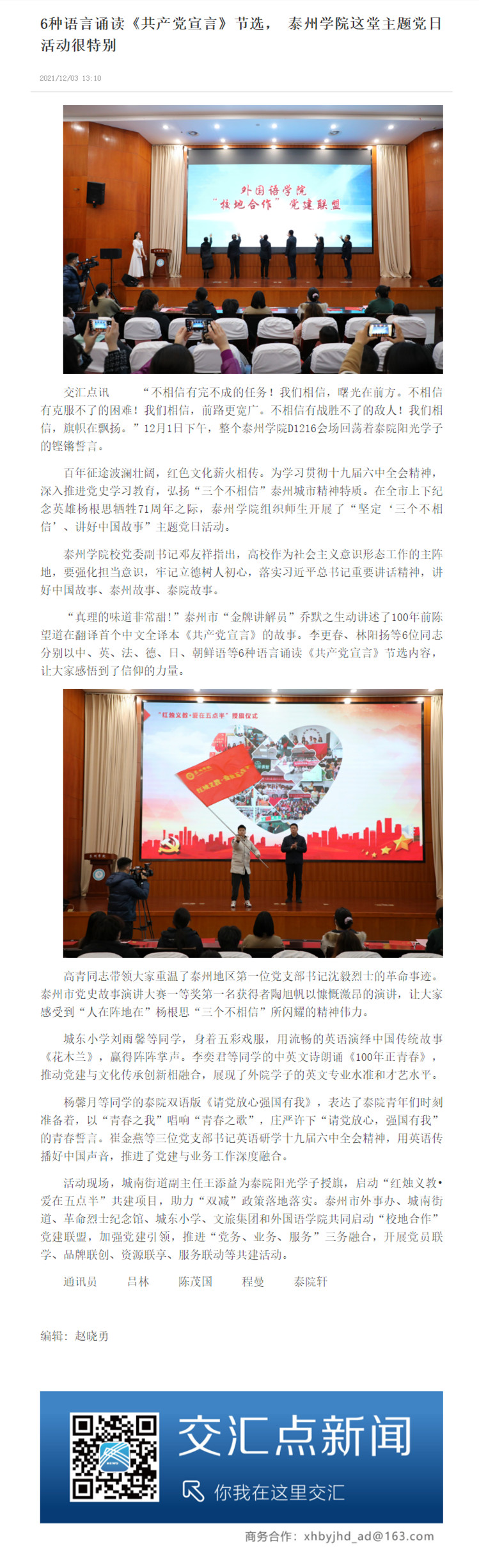 12月3日,《交汇点新闻》以《6种语言诵读<共产党宣言>节选, sunbet申搏官方网站这堂主题党日活动很特别》为题,报道sunbet申搏组织开展“坚定‘三个不相信’、讲好中国故事”主题党日活动。
