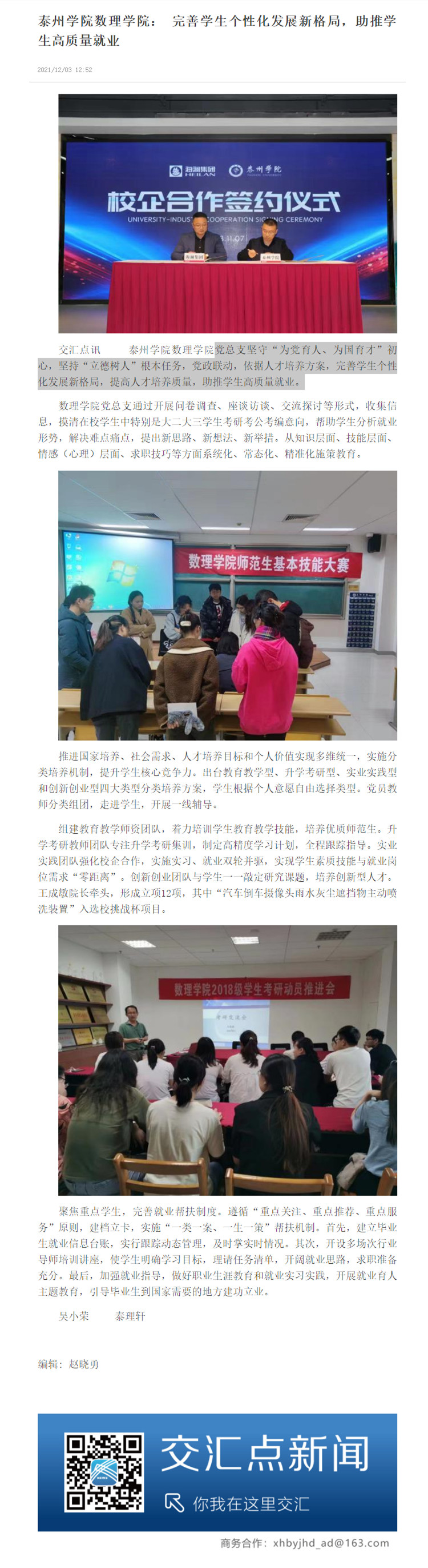 《交汇点新闻》12月3日报道sunbet申搏数理学院党总支坚守“为党育人、为国育才”初心,坚持“立德树人”根本任务,党政联动,依据人才培养方案,完善学生个性化发展新格局,提高人才培养质量,助推学生高质量就业。