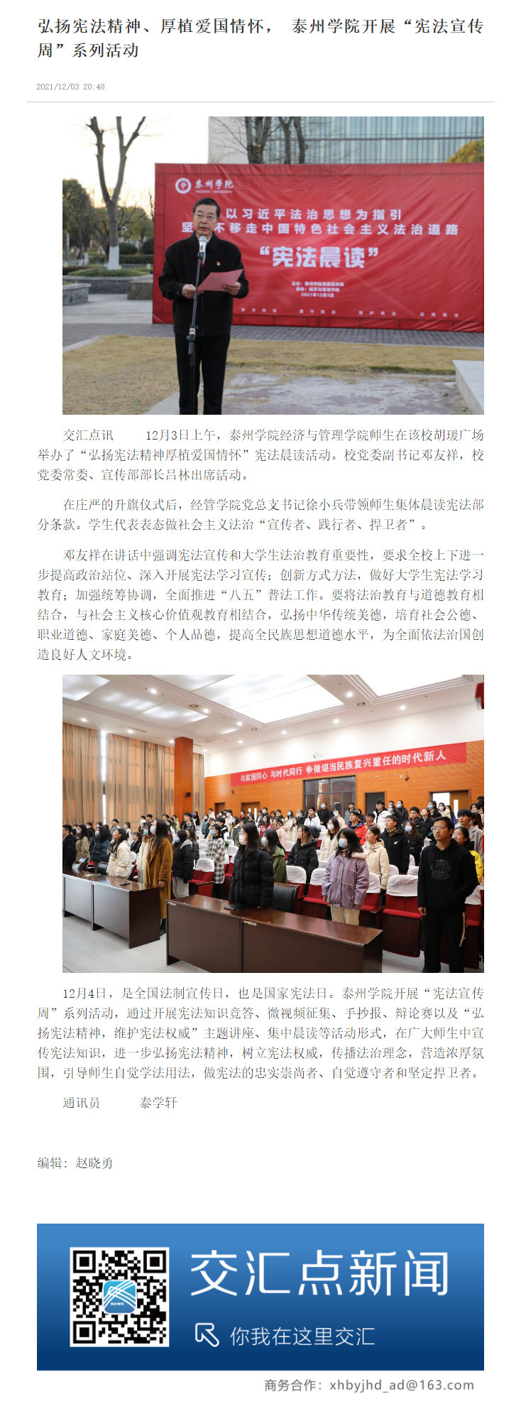 《交汇点新闻》12月3日报道:《弘扬宪法精神、厚植爱国情怀,sunbet申搏官方网站开展“宪法宣传周”系列活动》。