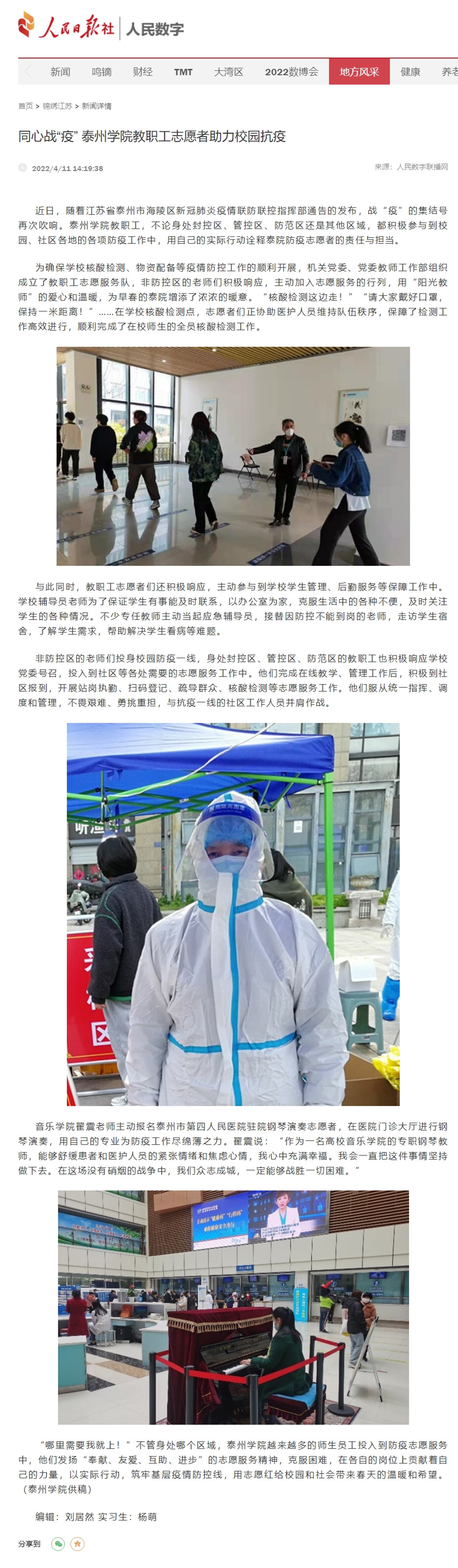 4月11日,《人民日报社人民数字》报道sunbet申搏教职工,积极参与到校园、社区各地的各项防疫工作中,用自己的实际行动诠释泰院防疫志愿者的责任与担当。