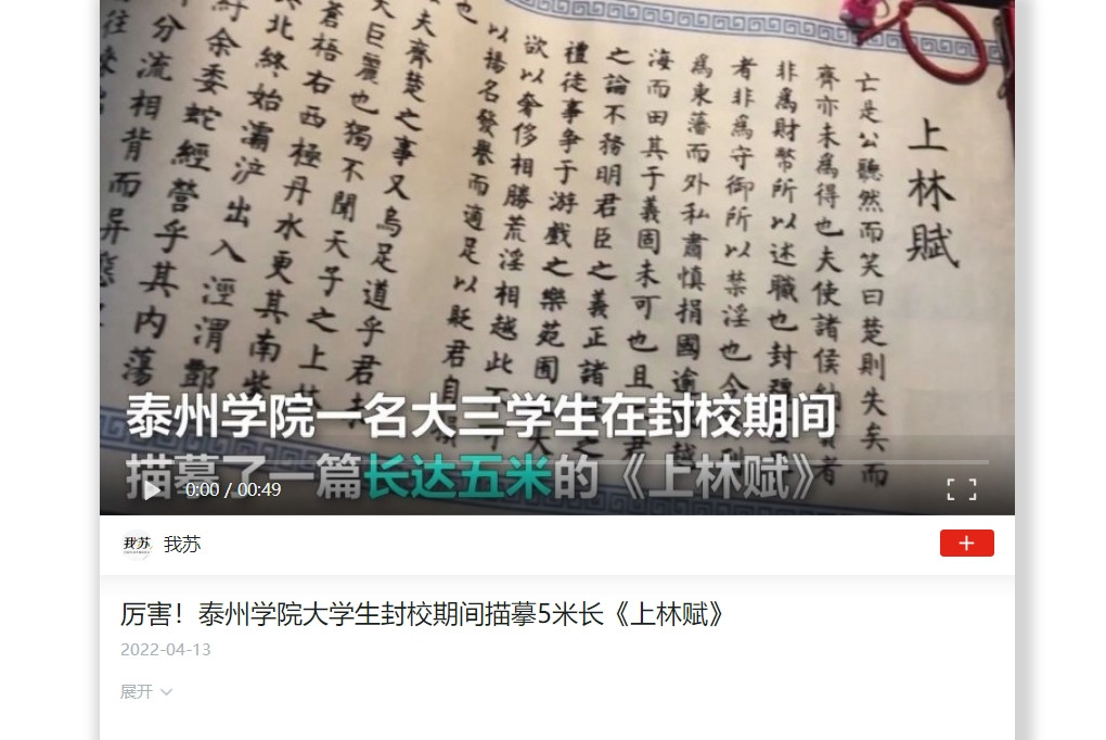 4月13日,“学习强国”平台发布视频,题为:《厉害!sunbet申搏官方网站大学生封校期间描摹5米长《上林赋》》,展示疫情期间sunbet申搏学生自律向上的精神状态。