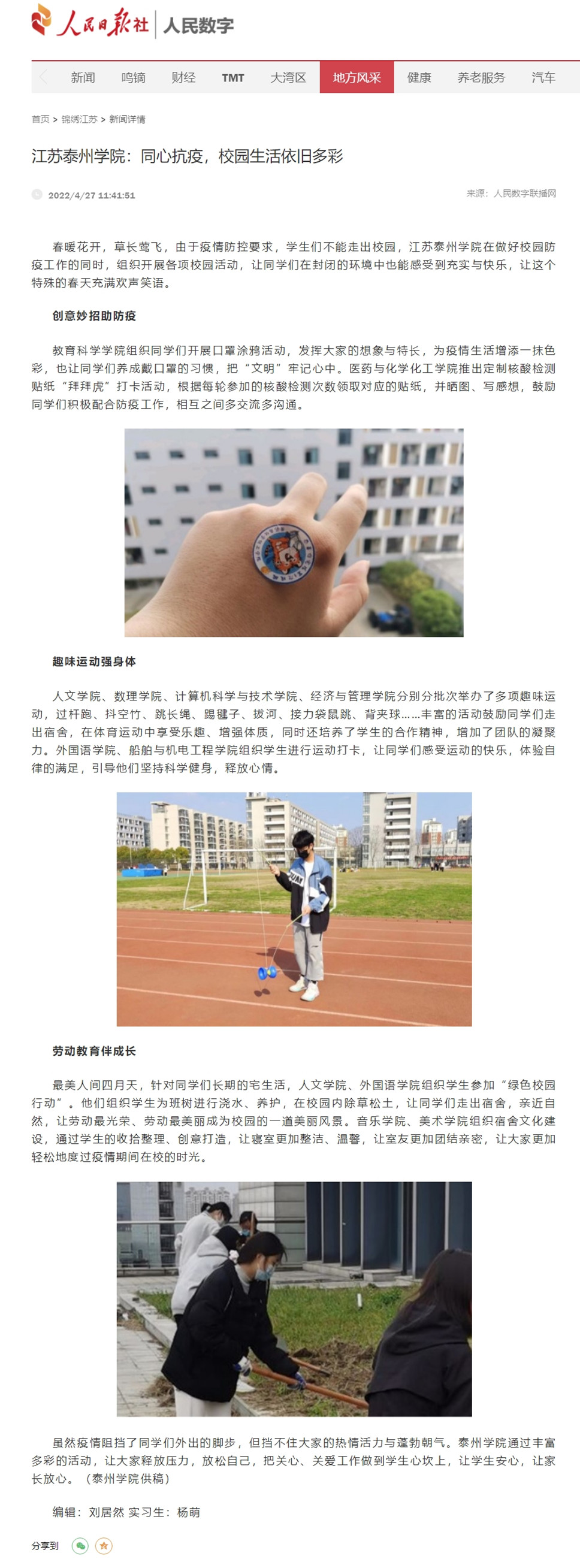 《人民日报社人民数字》4月27日报道sunbet申搏在做好校园防疫工作的同时,组织开展各项校园活动,让同学们在封闭的环境中也能感受到充实与快乐。