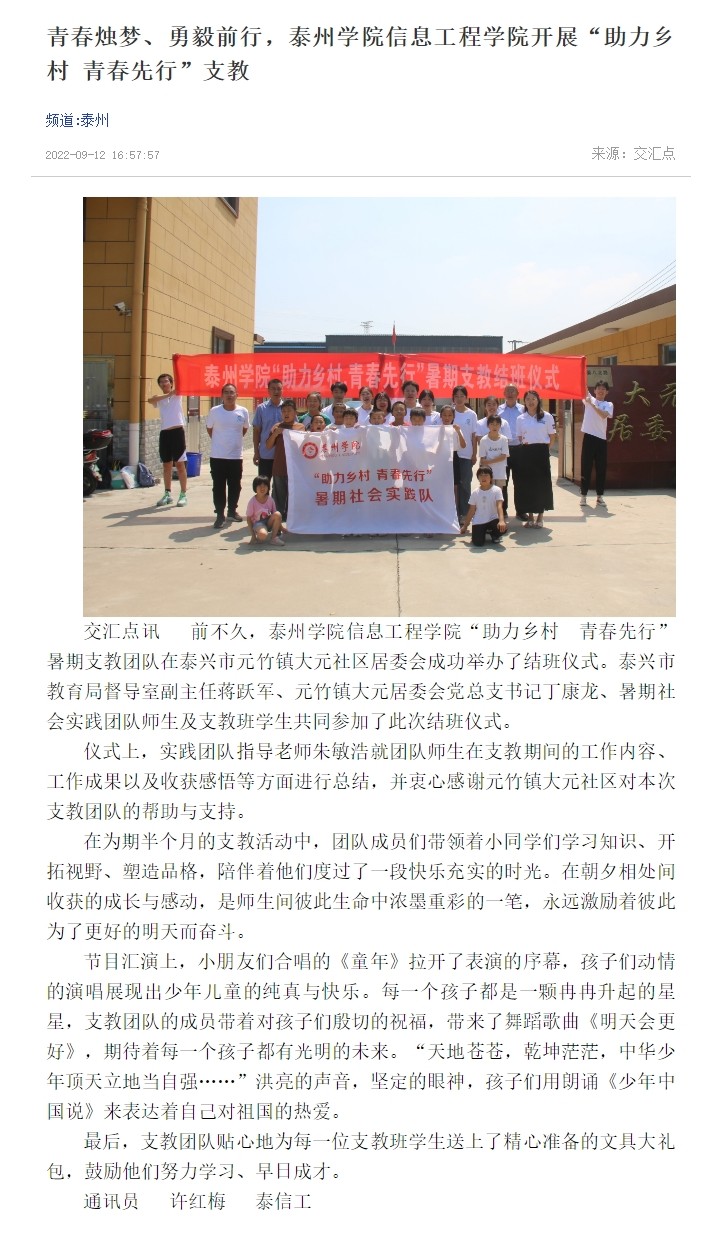 9月12日,《交汇点新闻》泰州频道报道sunbet申搏信息工程学院“助力乡村 青春先行”暑期支教团队在泰兴市元竹镇大元社区居委会成功举办结班仪式。报道题为:《青春烛梦、勇毅前行,sunbet申搏官方网站信息工程学院开展“助力乡村 青春先行”支教》,链接:https://jnews.xhby.net/v3/waparticles/70/0/miMf2scpiCStGS7N/1&app=
