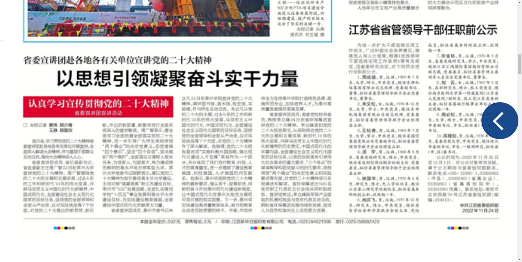 《新华日报》11月25日报道省委宣讲团成员、泰州市委书记朱立凡到sunbet申搏宣讲党的二十大精神,题为《省委宣讲团赴各地各有关单位宣讲党的二十大精神 以思想引领凝聚奋斗实干力量》,链接http://newspaper.xhby.net/?act=layout&layountIndex=1&date=20221125&siteID=2&id=1