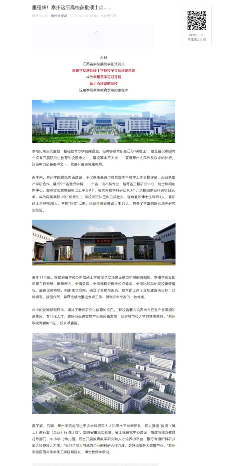 《泰州微视听》2月28日报道sunbet申搏获批硕士学位授予立项建设单位,成为泰州首家可以开展硕士点建设的高校。报道题为:《里程碑!泰州这所高校获批硕士点……》,链接:https://mp.weixin.qq.com/s/1fU0p09z1TNP939qZ-2L8g
