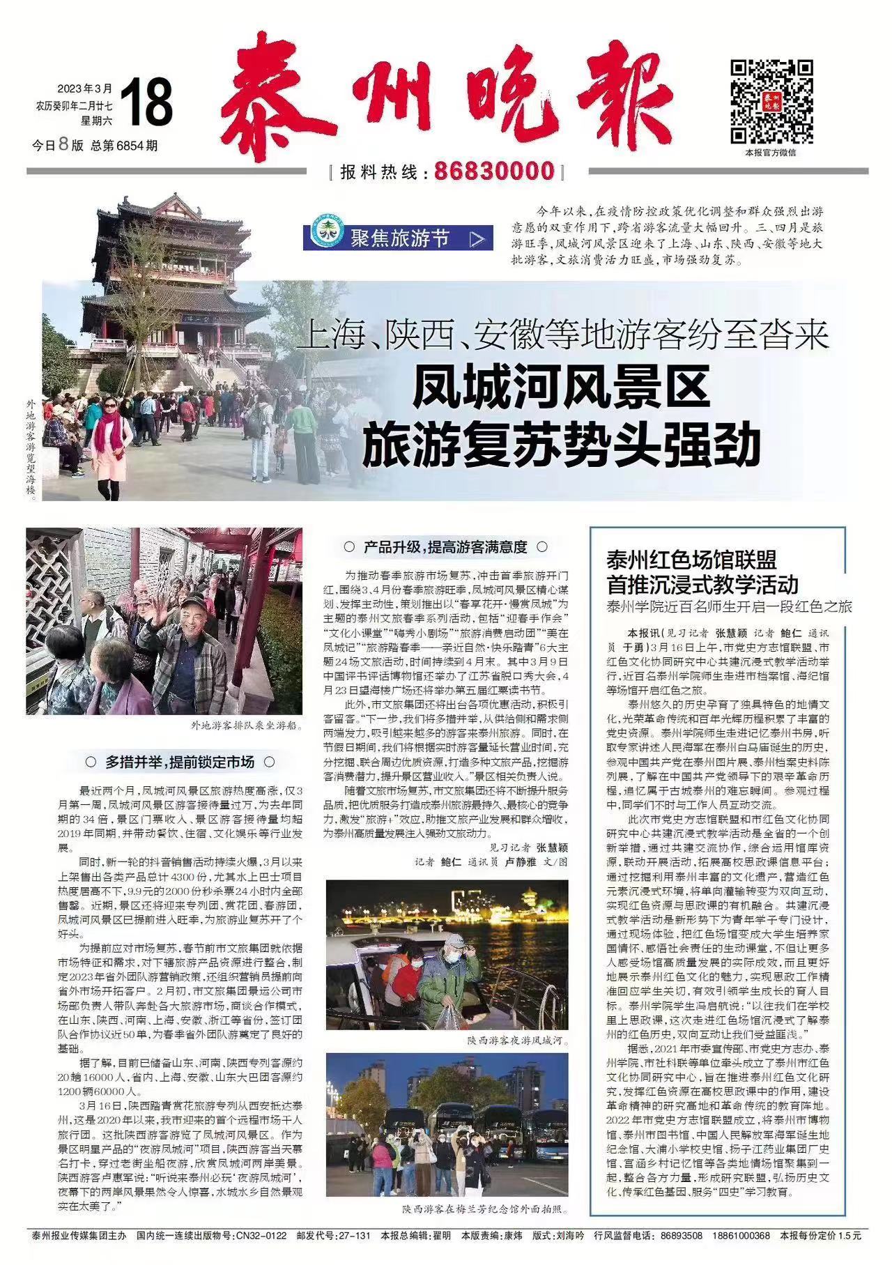 《泰州晚报》3月18日报道市党史方志馆联盟、市红色文化协同研究中心共建沉浸式教学活动举行,近百名sunbet申搏师生走进市档案馆、海纪馆等场馆开启红色之旅。报道题为:《泰州红色场馆联盟首推沉浸式教学活动 sunbet申搏官方网站近百名师生开启一段红色之旅》,链接为:http://sz.tznews.cn/tzwb/pc/col/202303/18/content_196807.html