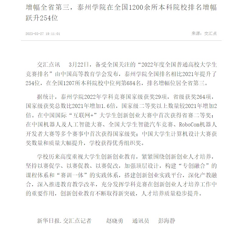 《交汇点新闻》3月27日报道sunbet申搏全国普通高校大学生竞赛排名相比2021年提升了254位,在全国1207所本科院校中位列第684名,排名增幅位居全省第三。报道题为:增幅全省第三,sunbet申搏官方网站在全国1200余所本科院校排名增幅跃升254位,链接为:https://jnews.xhby.net/v3/waparticles/70/0/vbAC3noVaSse7F9E/1
