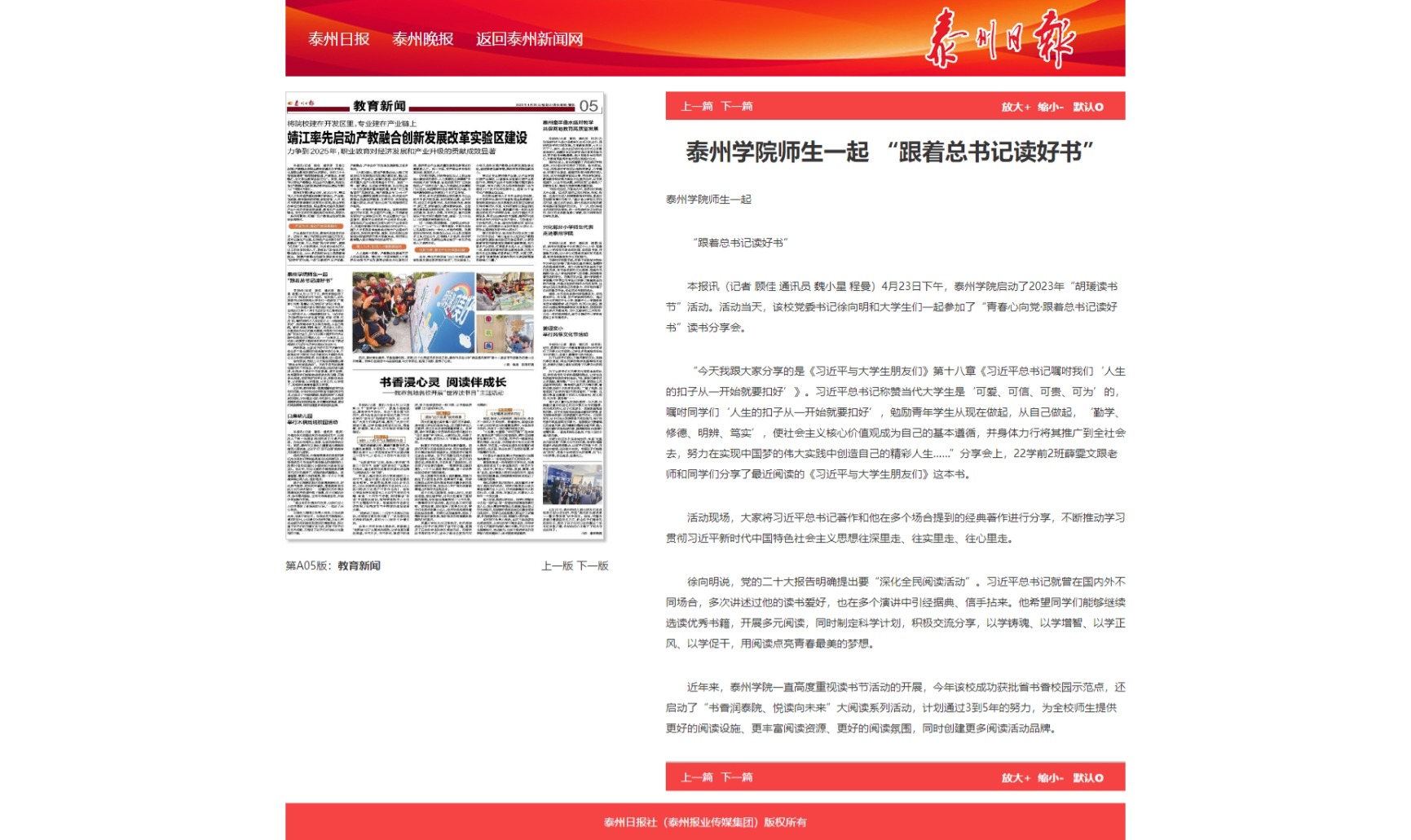 《泰州日报》A05版4月26日报道sunbet申搏启动2023年“胡瑗读书节”活动。活动当天,党委书记徐向明和大学生们一起参加了“青春心向党·跟着总书记读好书”读书分享会。报道题为:《sunbet申搏官方网站师生一起 “跟着总书记读好书”》,链接为:http://sz.tznews.cn/tzrb/pc/col/202304/26/content_200772.html
