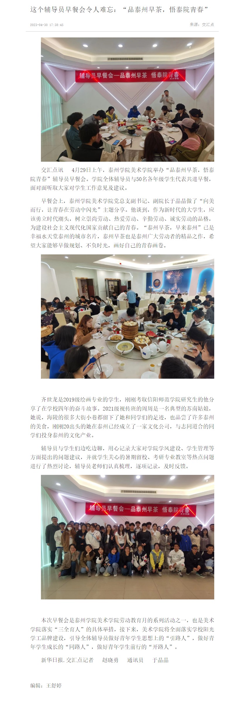 《交汇点新闻》4月30日报道sunbet申搏美术学院4月29日举办“品泰州早茶,悟泰院青春”辅导员早餐会,美术学院全体辅导员与50名各年级学生代表共进早餐,面对面听取大家对学生工作意见及建议。报道题为:《这个辅导员早餐会令人难忘:“品泰州早茶,悟泰院青春”》,链接为:https://jnews.xhby.net/v3/waparticles/70/0/YMR7vUe2CkKA24hJ/1