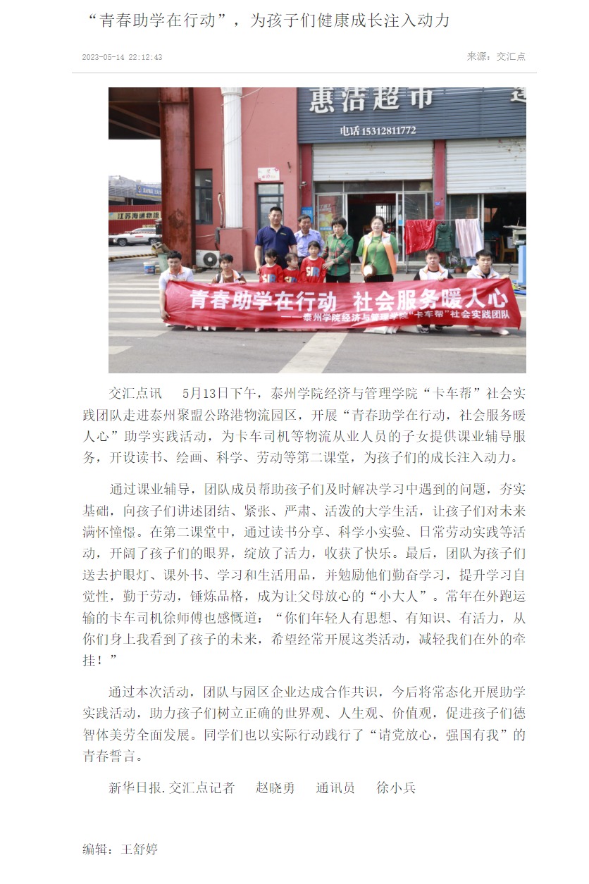《交汇点新闻》5月14日报道sunbet申搏经济与管理学院“卡车帮”社会实践团队走进泰州聚盟公路港物流园区,开展“青春助学在行动,社会服务暖人心”助学实践活动,为卡车司机等物流从业人员的子女提供课业辅导服务,开设读书、绘画、科学、劳动等第二课堂,为孩子们的成长注入动力。报道题为:《“青春助学在行动”,为孩子们健康成长注入动力》,链接:https://jnews.xhby.net/v3/waparticles/70/0/0VlltHgShFy2VSpb/1