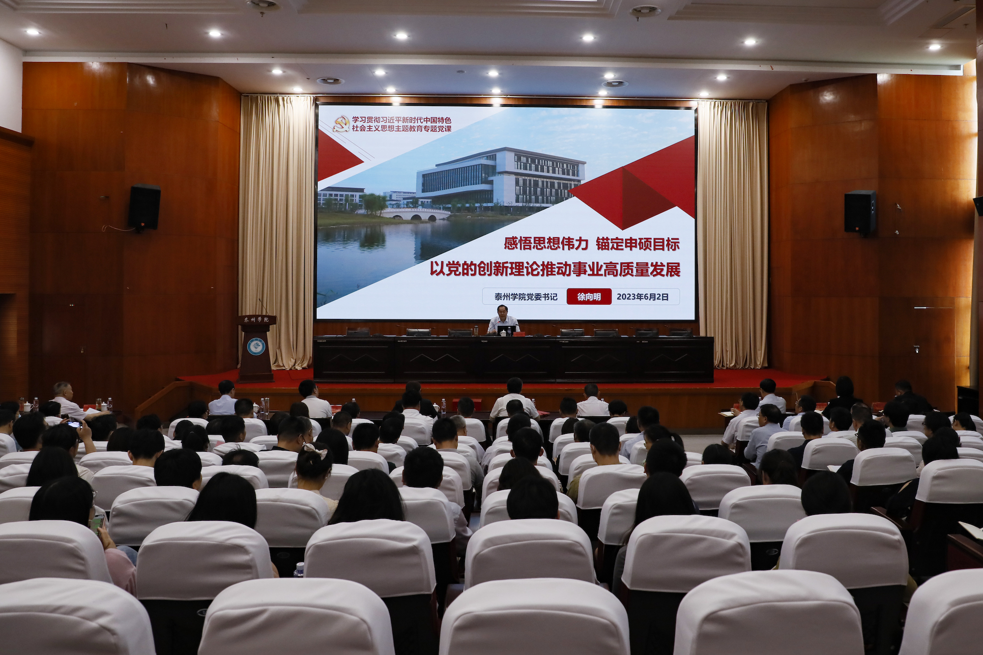 为持续、深入、高质量开展学习贯彻习近平新时代中国特色社会主义思想主题教育,推动促进学校事业高质量发展,6月2日下午,校党委书记徐向明为全体中层以上干部、师生党员代表讲“感悟思想伟力 锚定申硕目标 以党的创新理论推动事业高质量发展”专题党课。