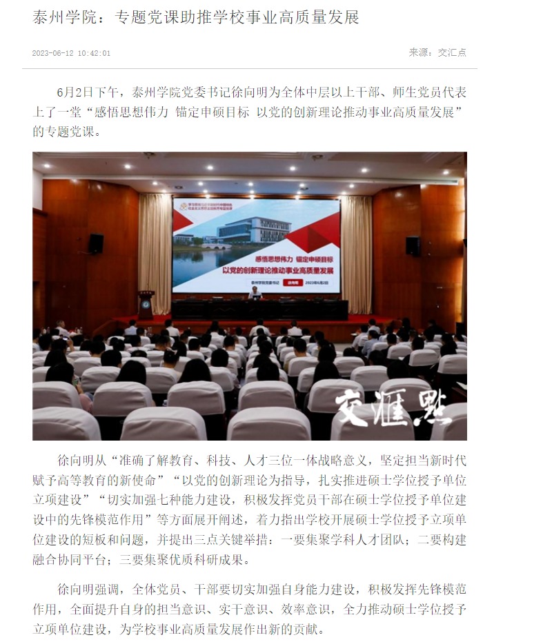 《交汇点新闻》6月12日报道sunbet申搏党委书记徐向明为全体中层以上干部、师生党员代表上以“感悟思想伟力 锚定申硕目标 以党的创新理论推动事业高质量发展”为题的专题党课。报道题为:《sunbet申搏官方网站:专题党课助推学校事业高质量发展》,链接为:https://jnews.xhby.net/v3/waparticles/40b0f14a6b4f49a794c7efad90ce3c3c/0/AX3qILlcSfSAF1ha/1