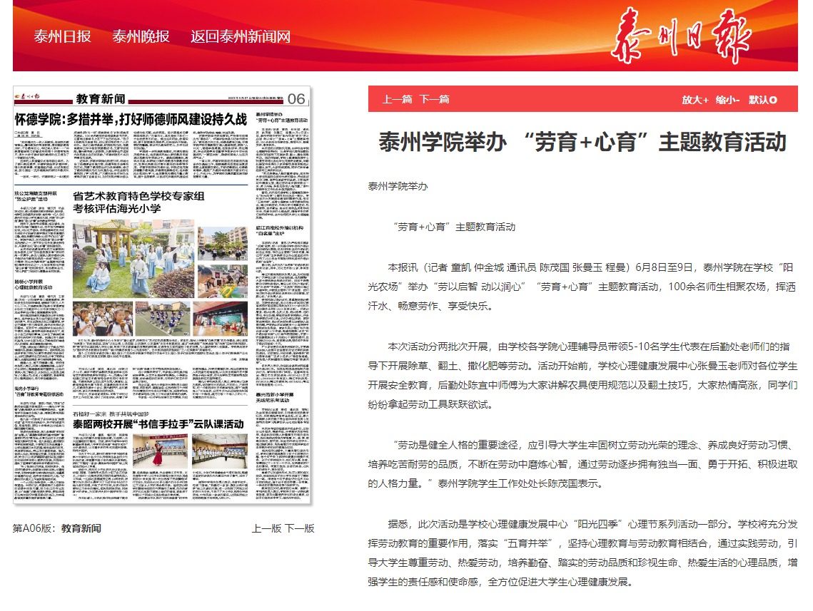 《泰州日报》6月21日报道6月8日至9日,sunbet申搏在学校“阳光农场”举办“劳以启智 动以润心”“劳育+心育”主题教育活动,100余名师生相聚农场,挥洒汗水、畅意劳作、享受快乐。报道题为:《sunbet申搏官方网站举办 “劳育+心育”主题教育活动》,链接为:http://sz.tznews.cn/tzrb/pc/col/202306/21/content_206643.html