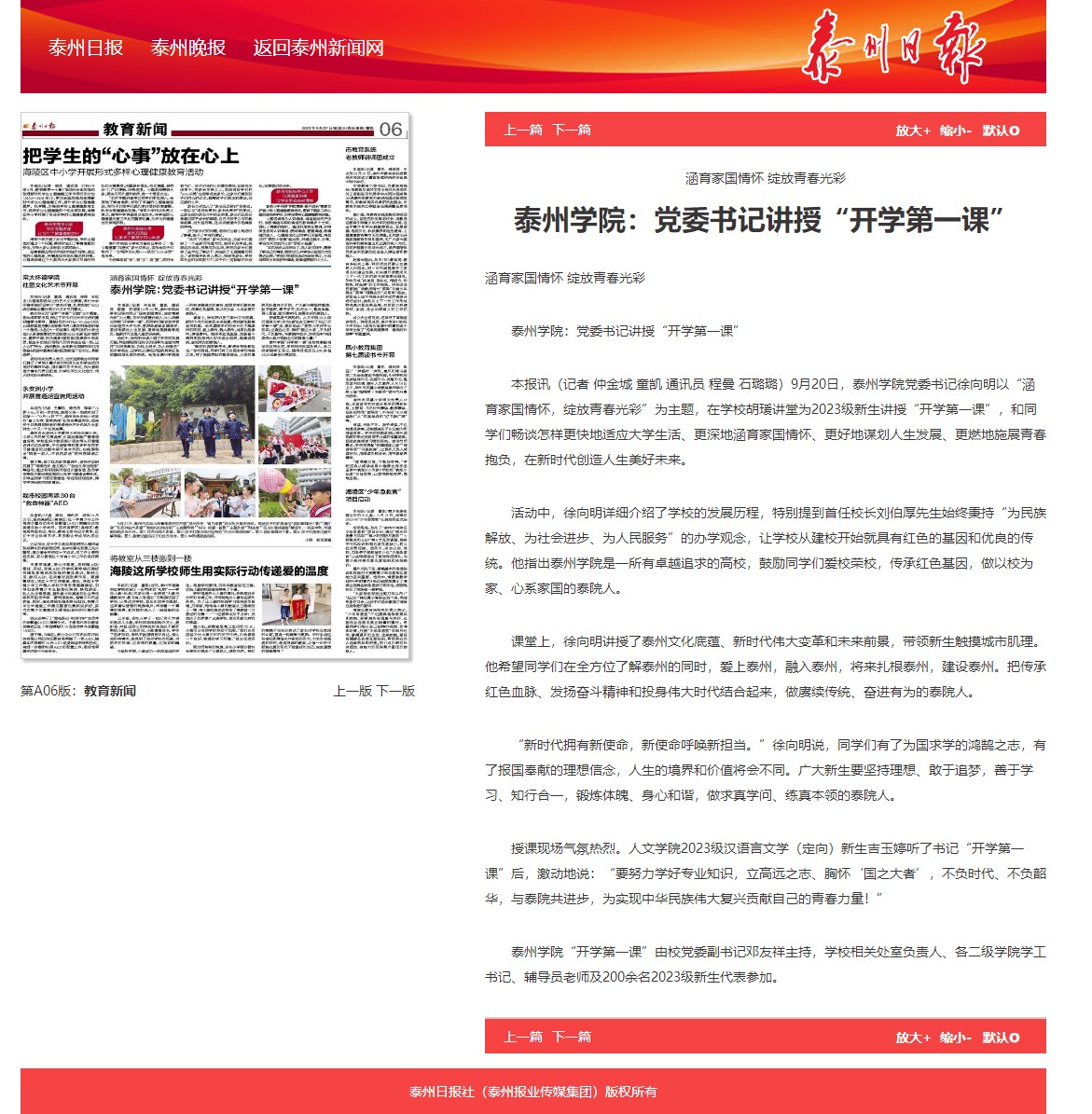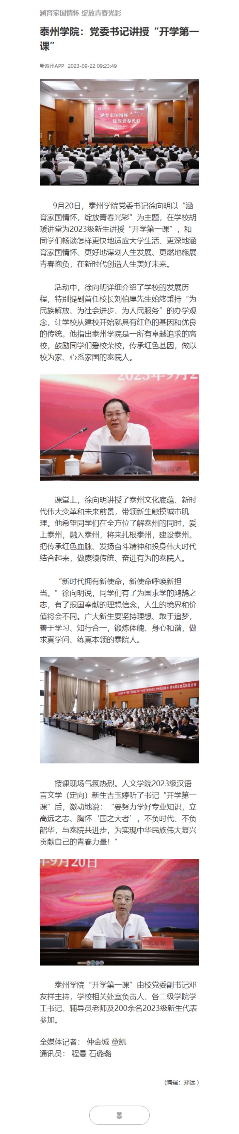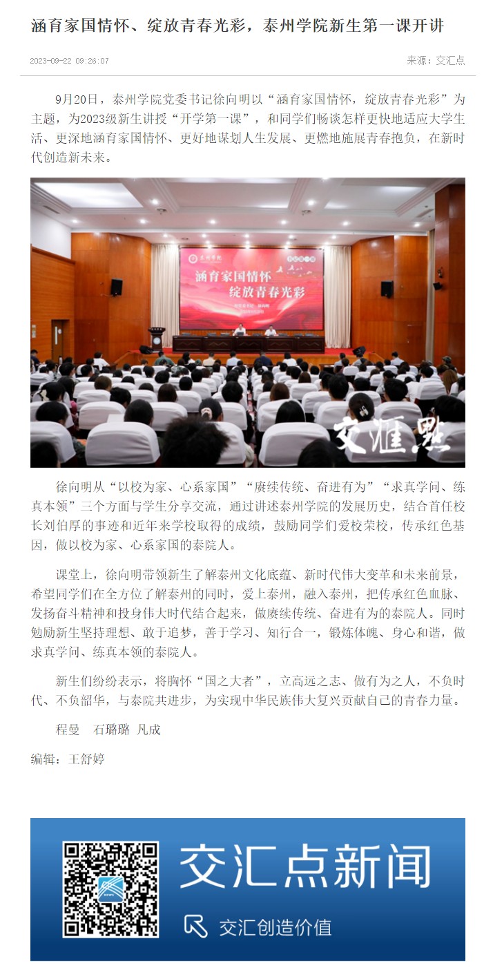 《交汇点新闻》《新泰州》2023年9月22日,《泰州日报》9月27日报道《涵育家国情怀 绽放青春光彩 sunbet申搏官方网站:党委书记讲授“开学第一课”》,链接: