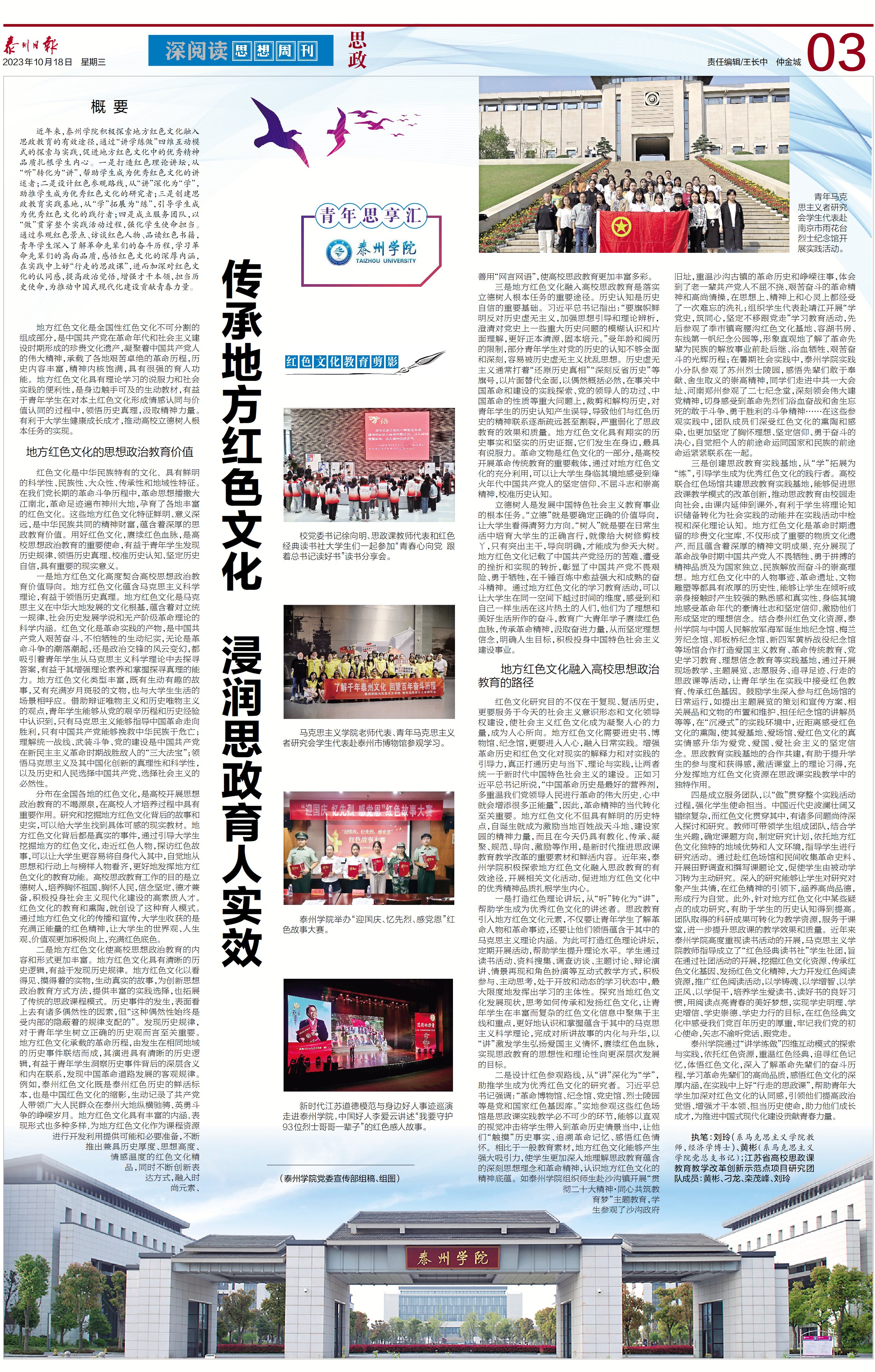 2023年10月18日,《泰州日报》第A03版思政推出《传承地方红色文化 浸润思政育人实效》报道,展现近年来sunbet申搏积极探索地方红色文化融入思政教育的研究成果,探索、实践“讲学练做”四维互动模式,促进地方红色文化中的优秀精神品质扎根学生内心。报道链接:http://sz.tznews.cn/tzrb/pc/layout/202310/18/node_A03.html