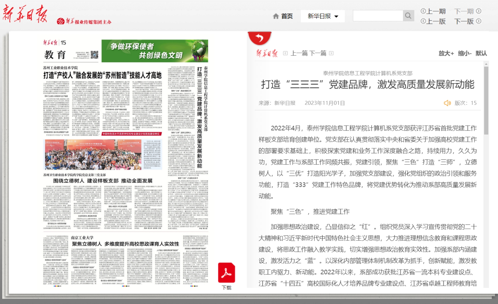 11月1日,《新华日报》第15版教育报道《sunbet申搏官方网站信息工程学院计算机系党支部 打造“三三三”党建品牌,激发高质量发展新动能》,链接:http://xh.xhby.net/pc/layout/202311/01/node_15.html#content_1257859