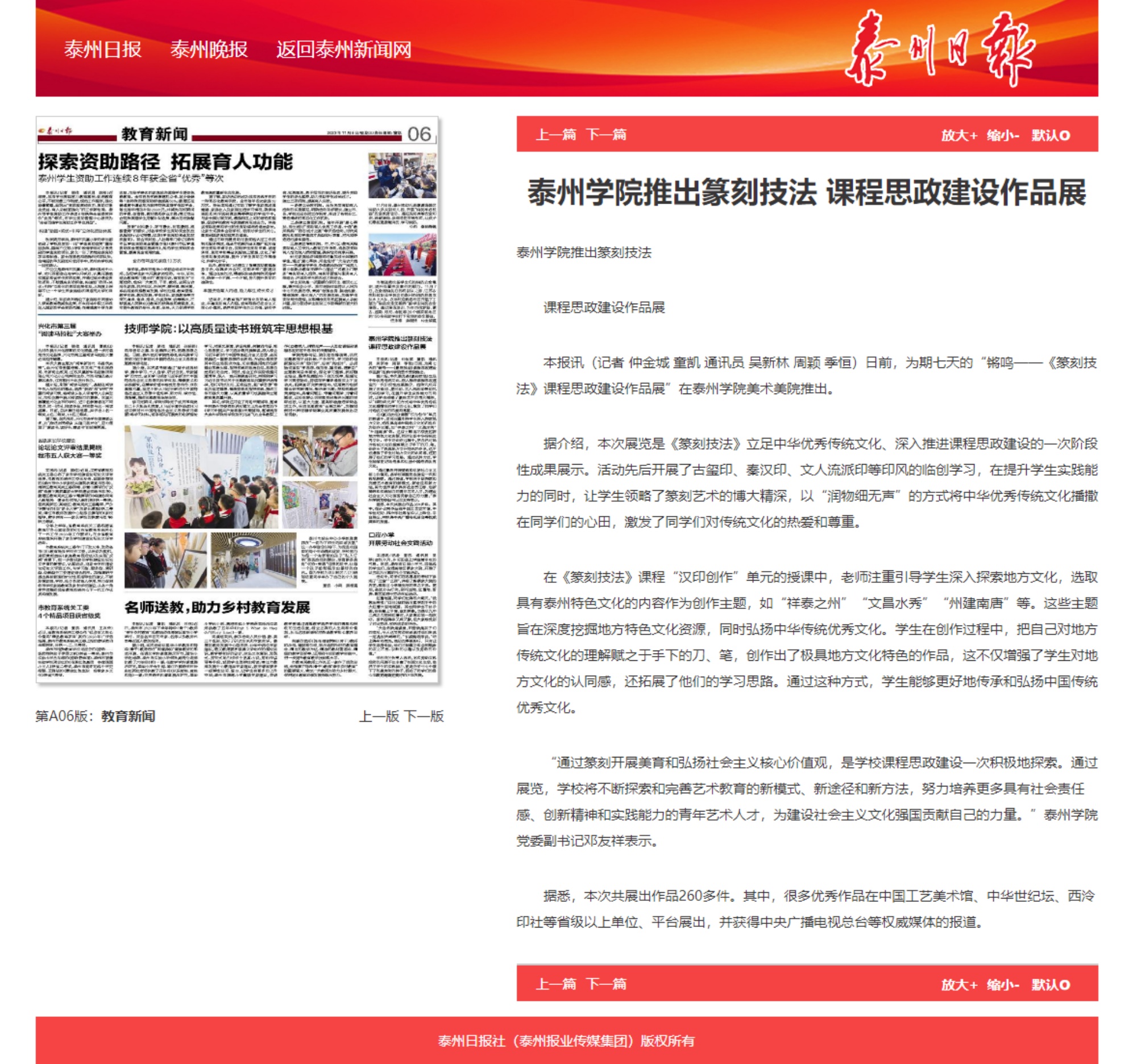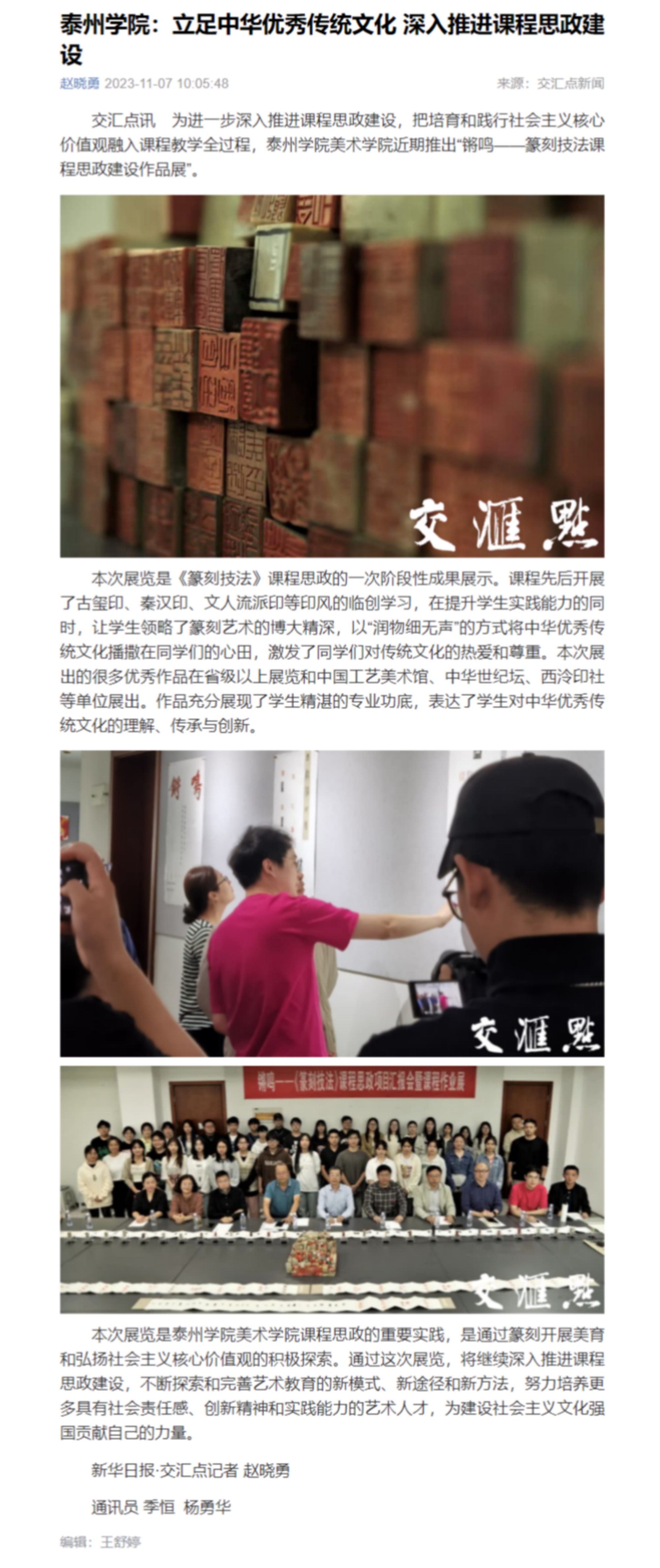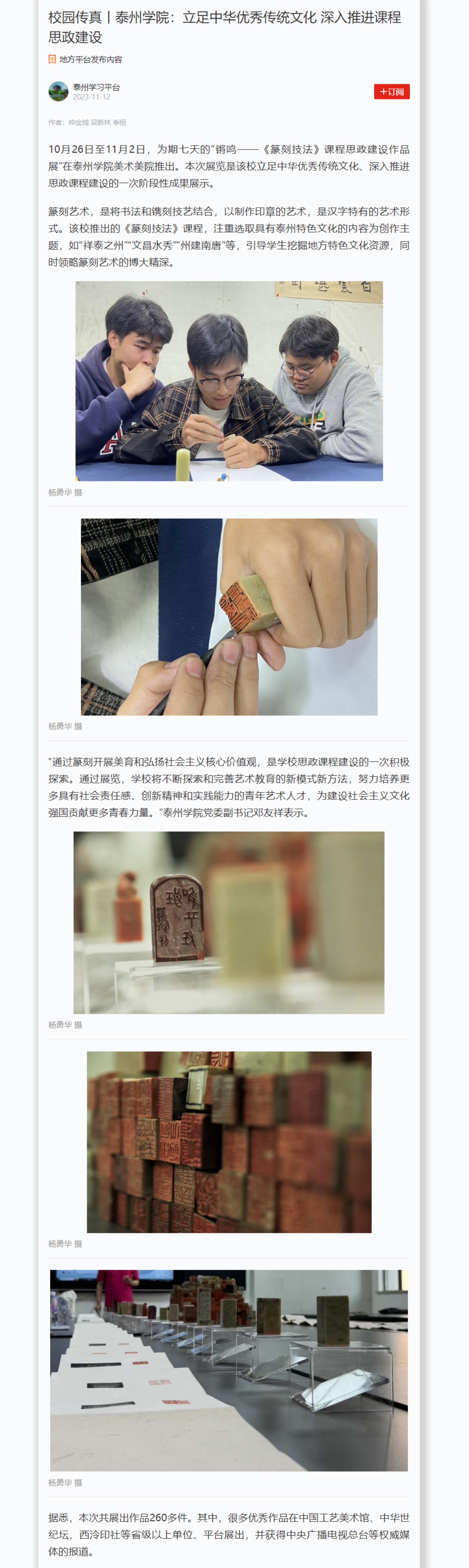 《交汇点新闻》11月7日以《sunbet申搏官方网站:立足中华优秀传统文化 深入推进课程思政建设》为题,《泰州日报》11月8日以《sunbet申搏官方网站推出篆刻技法课程思政建设作品展》为题,《学习强国》11月12日以《校园传真丨sunbet申搏官方网站:立足中华优秀传统文化 深入推进课程思政建设》为题,报道sunbet申搏篆刻技法课程思政建设作品展。