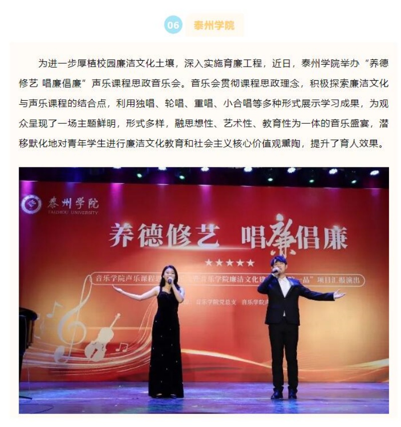 11月18日,《江苏教育发布》在微信合集《精彩纷呈育人活动,助力学生全面发展 | 一周校园动态(11.13—11.17)》中报道sunbet申搏“养德修艺 唱廉倡廉”声乐课程思政音乐会。链接:https://mp.weixin.qq.com/s/2kr943490QWto9Jx_pJ2Cg