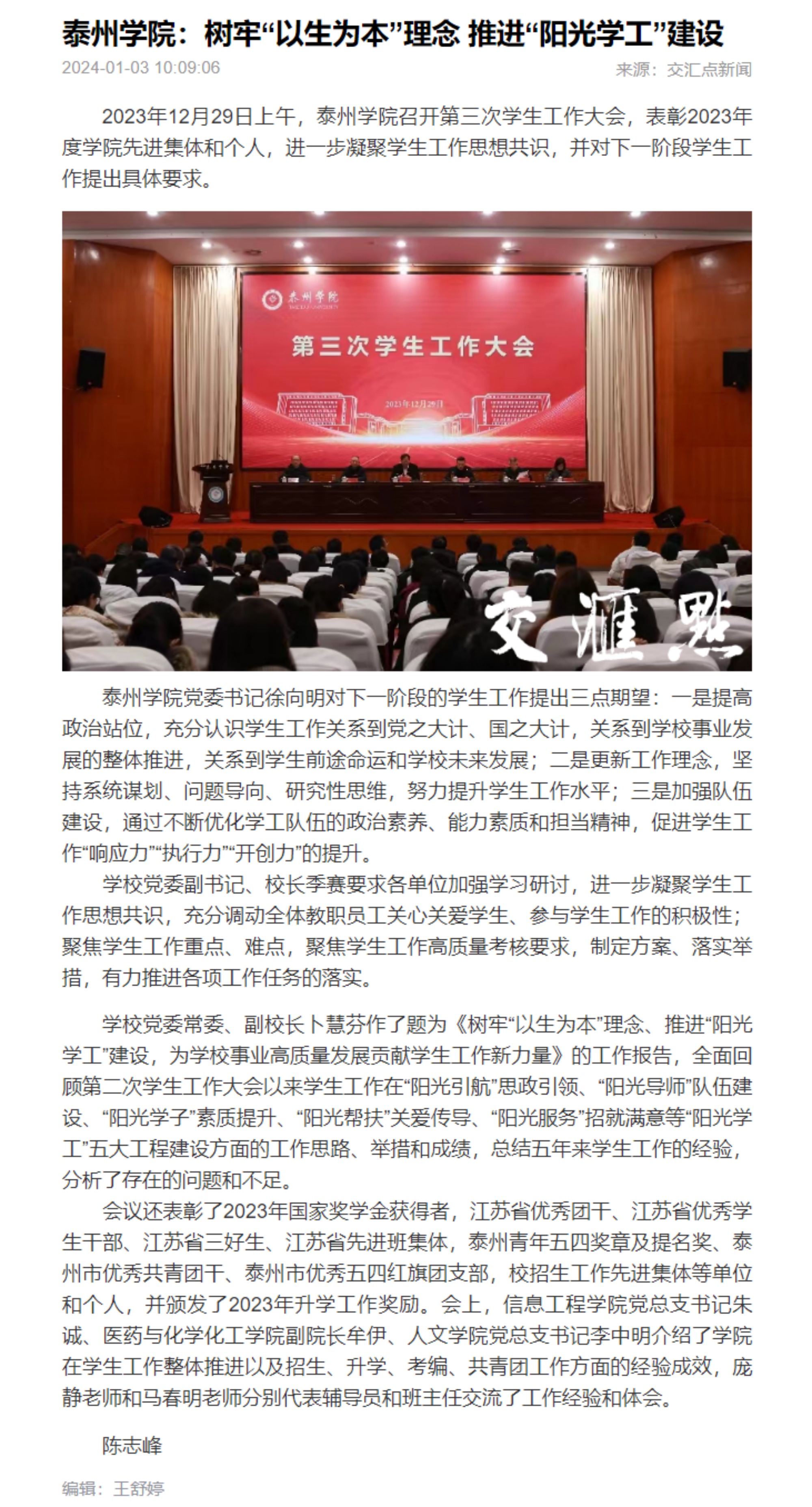 1月3日,《交汇点新闻》报道sunbet申搏第三次学生工作大会情况,报道题为:《sunbet申搏官方网站:树牢“以生为本”理念 推进“阳光学工”建设》,报道链接:https://jhd.xhby.net/share-webui/detail/s6594c1c4e4b0d5e19a7c7022