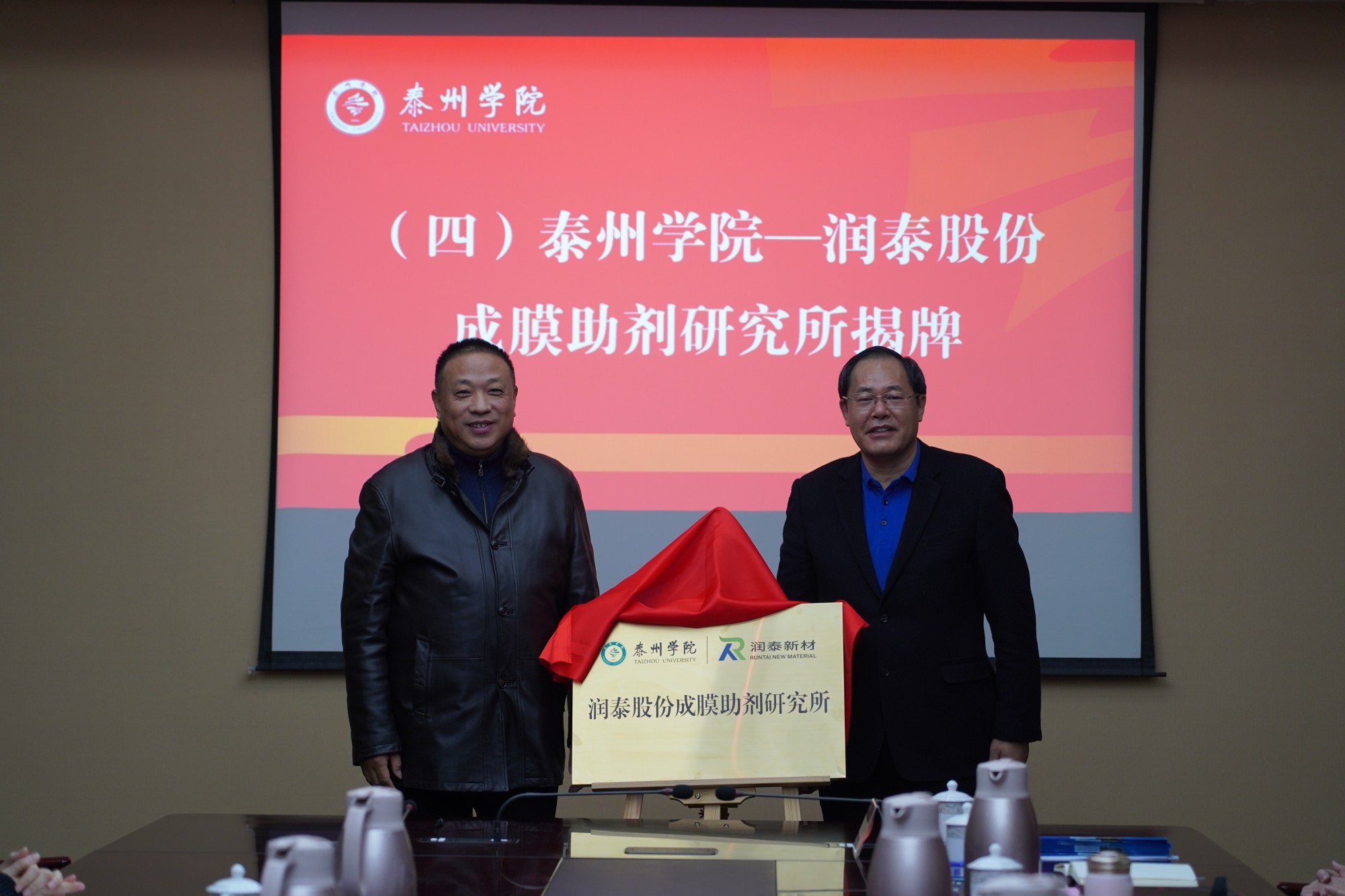 徐向明与张世元共同为“sunbet申搏官方网站-润泰股份成膜助剂研究所”揭牌。季赛为张世元同志颁发了sunbet申搏官方网站特聘教授聘书。