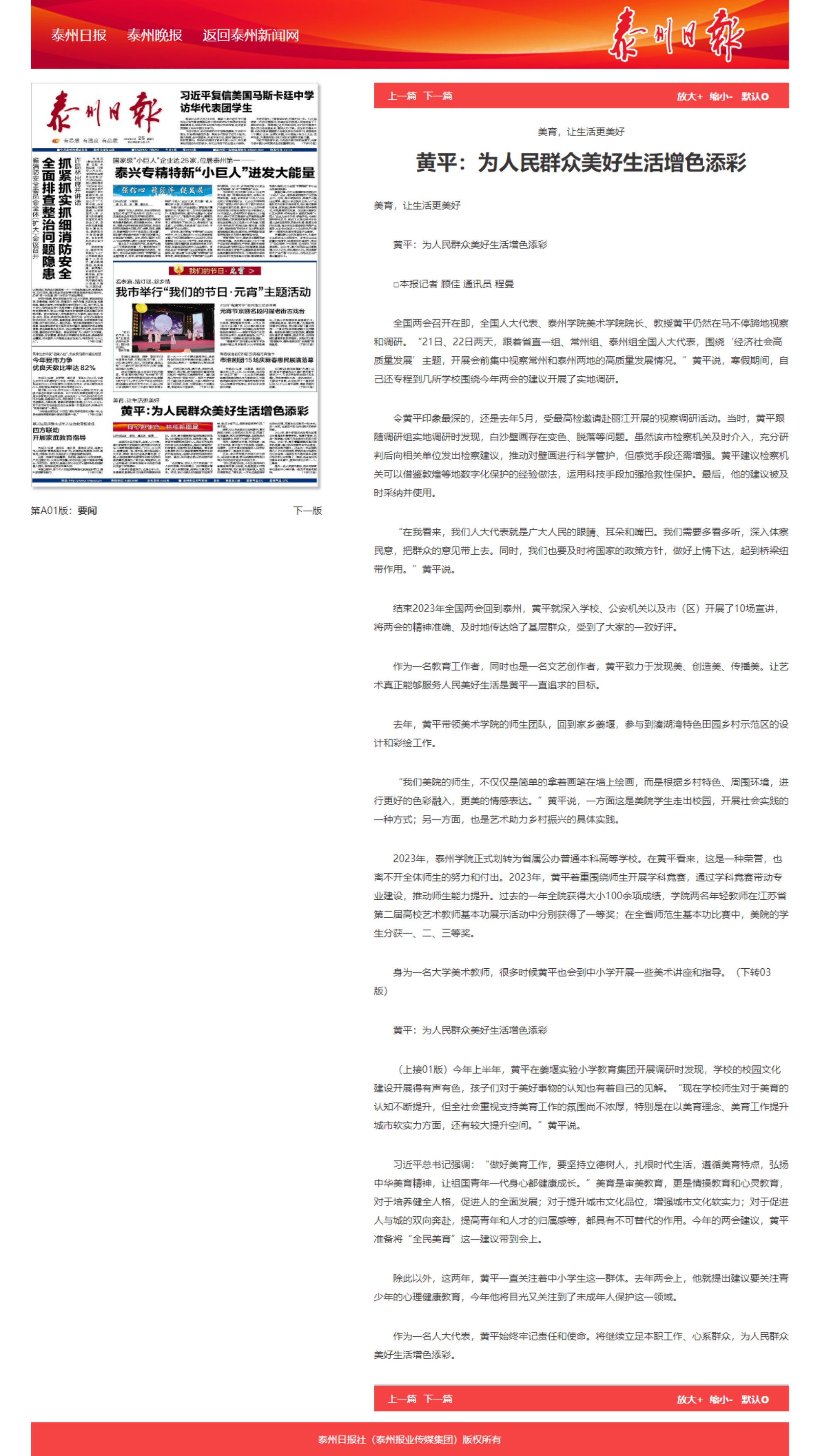 2024年2月25日,《泰州日报》第A01版要闻报道《美育,让生活更美好 黄平:为人民群众美好生活增色添彩》。