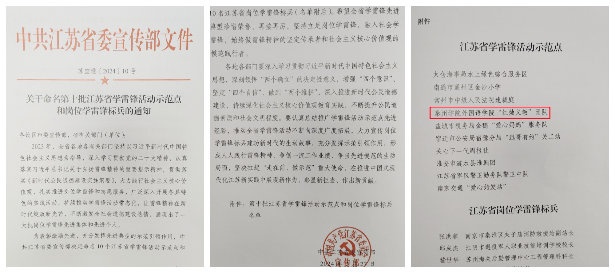 在学雷锋纪念日到来之际,江苏省委宣传部发布并表彰第十批江苏省学雷锋活动示范点(10个)和岗位学雷锋标兵,sunbet申搏外国语学院“红烛义教”团队作为唯一高校志愿服务团队入选。项目负责人马永明接受江苏卫视采访,荔枝新闻全程直播《雷锋,是我们共同的名字》,新华日报专栏介绍,《交汇点新闻》《中国江苏网》等给予报道。