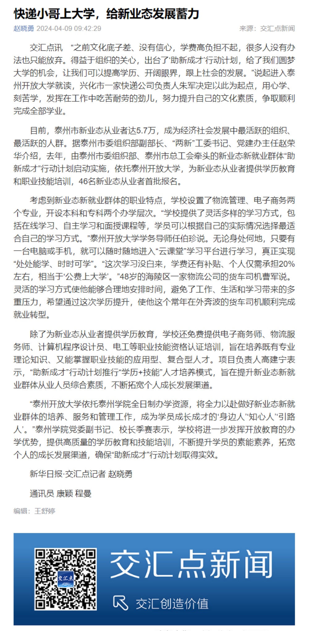 2024年4月9日,《交汇点新闻》报道泰州开放大学相关工作,报道链接:https://jhd.xhby.net/share-webui/detail/s66149d06e4b024c1153bdeaa