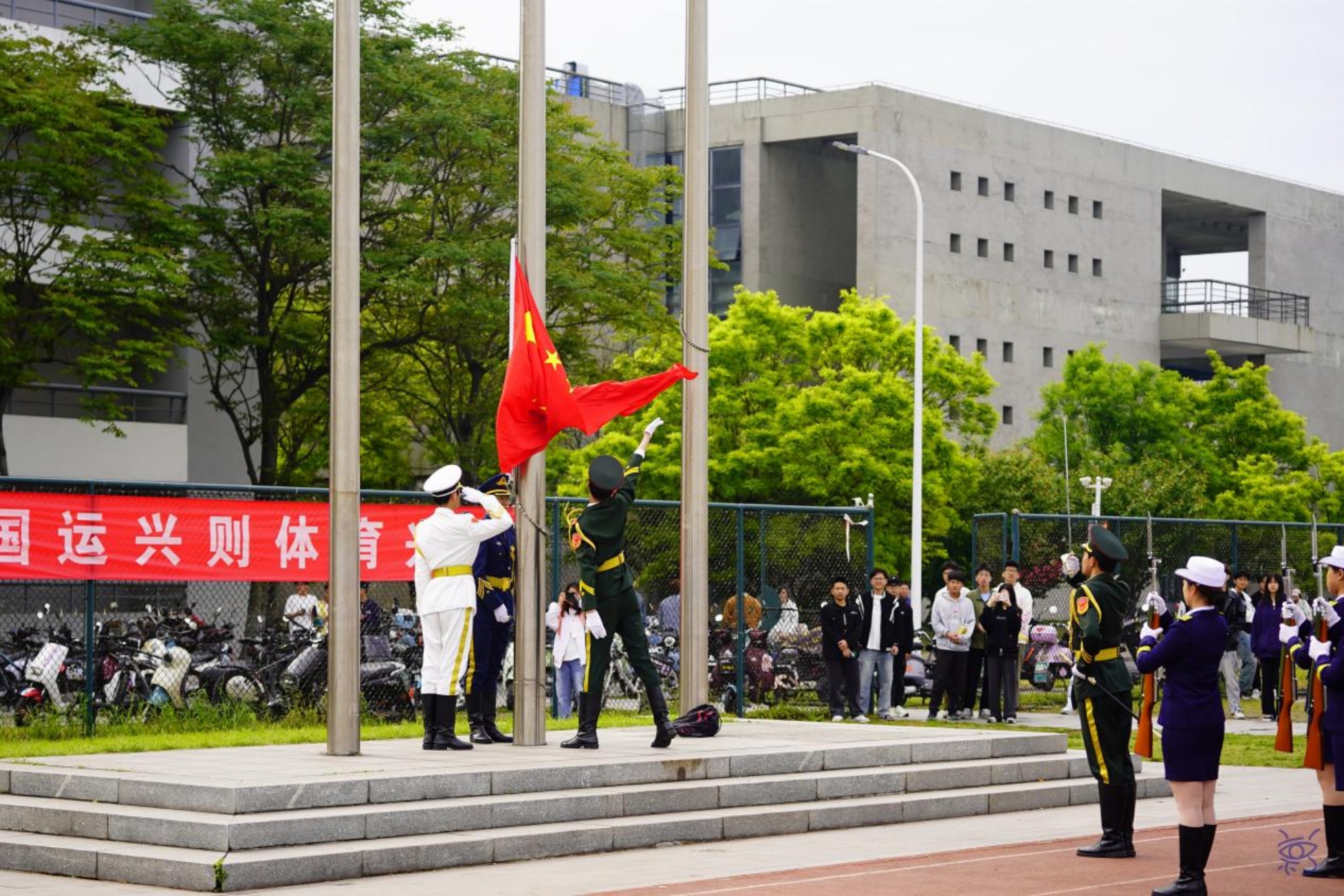 开幕式上举行了庄严的升国旗仪式,全体师生齐唱国歌。运动员们列队整齐,情绪高涨,展现了学校师生斗志昂扬的精神风貌。