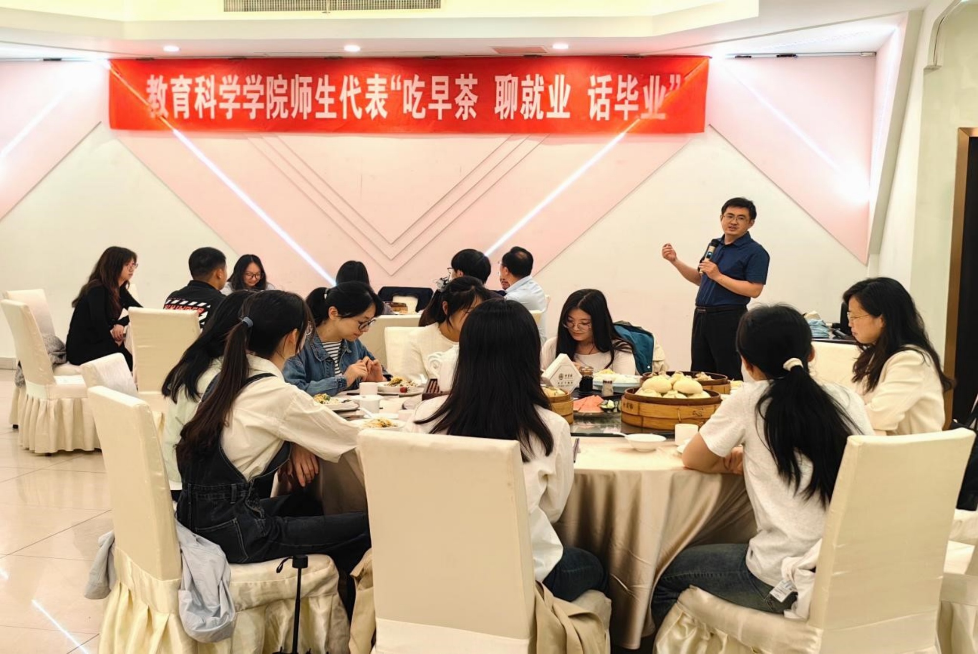 为引导毕业生准确把握当下就业形势,合理规划毕业去向,教育科学学院于6月1日举办“吃早茶 聊就业 话毕业”早茶座谈会。师生代表们共品泰州早茶,感恩泰院时光。早茶会由院党总支副书记孙晓敏主持。