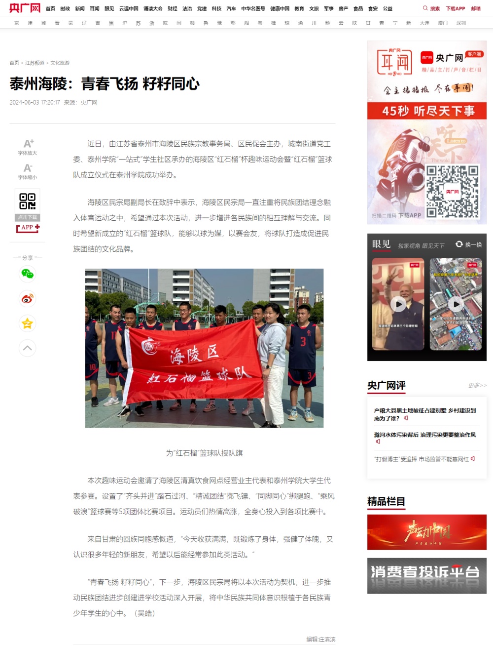 《央广网》2024年6月3日报道在sunbet申搏举办的海陵区“红石榴”杯趣味运动会暨“红石榴”篮球队成立仪式,报道题为:《泰州海陵:青春飞扬 籽籽同心》,报道链接:https://js.cnr.cn/whly/20240603/t20240603_526728459.shtml
