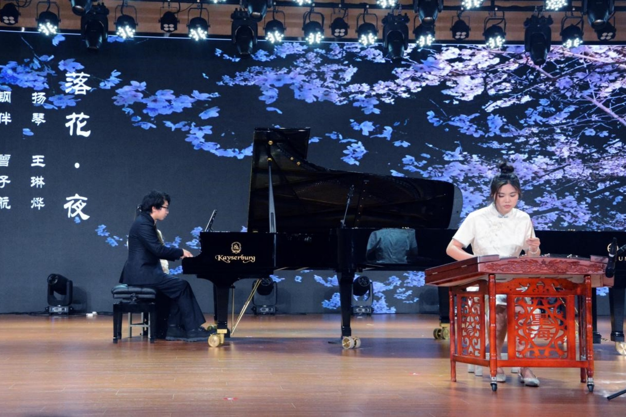 接着,朱子君和树文红老师的十多位学生先后登台演奏。他们以多种形式上演了钢琴独奏《刘三姐主题幻想曲》、双钢琴合奏《胡桃夹子组曲之进行曲》、四手联弹《草原英雄小姐妹》《洋娃娃组曲之凯蒂圆舞曲》、六手联弹《A大调浪漫曲》、八手联弹《加洛普进行曲》《骷髅之舞》、钢琴扬琴合奏《落花·夜》等多首中外名曲。学生们的演奏精彩纷呈,各具特色,充分展示了音乐学院的教学成果。