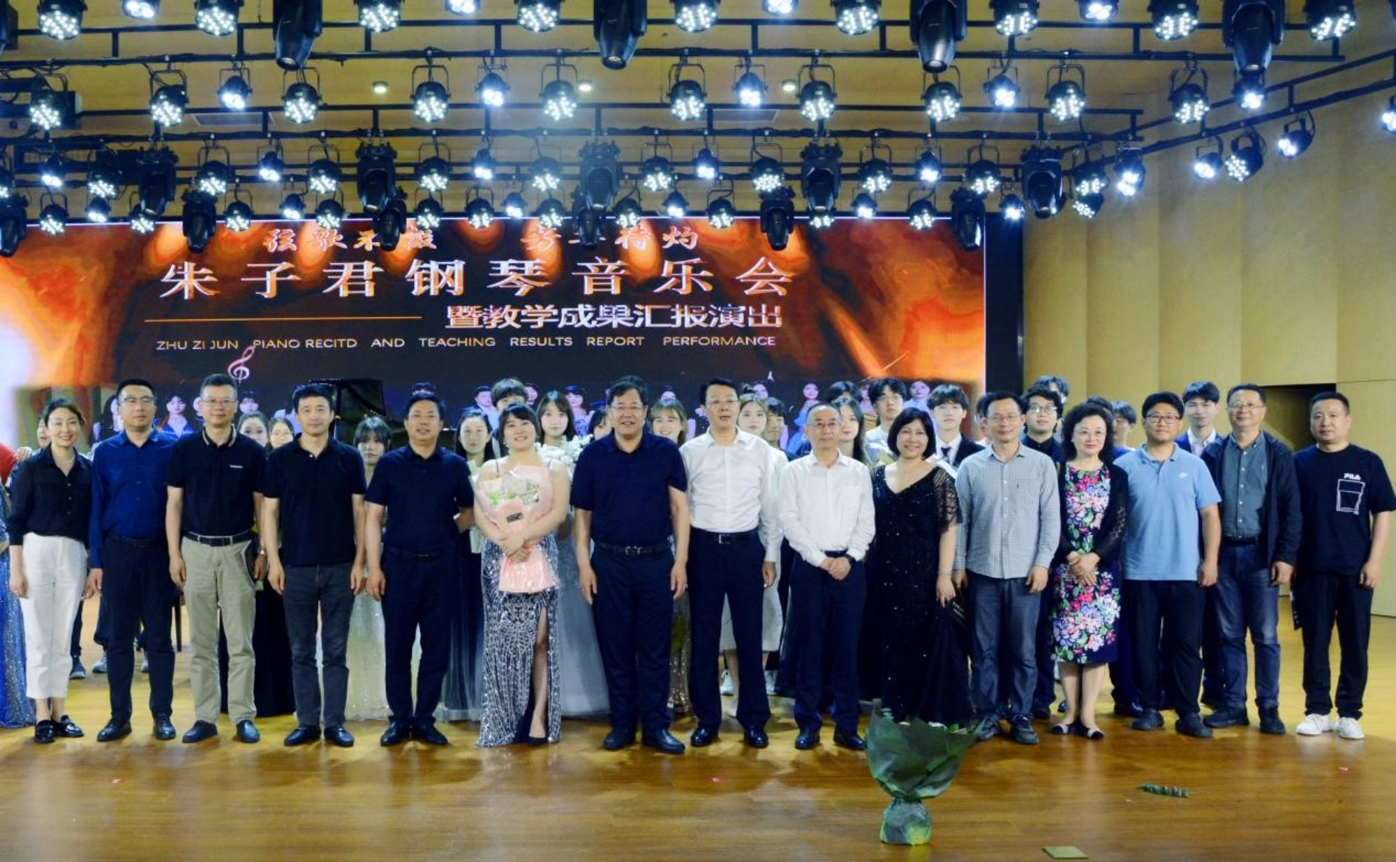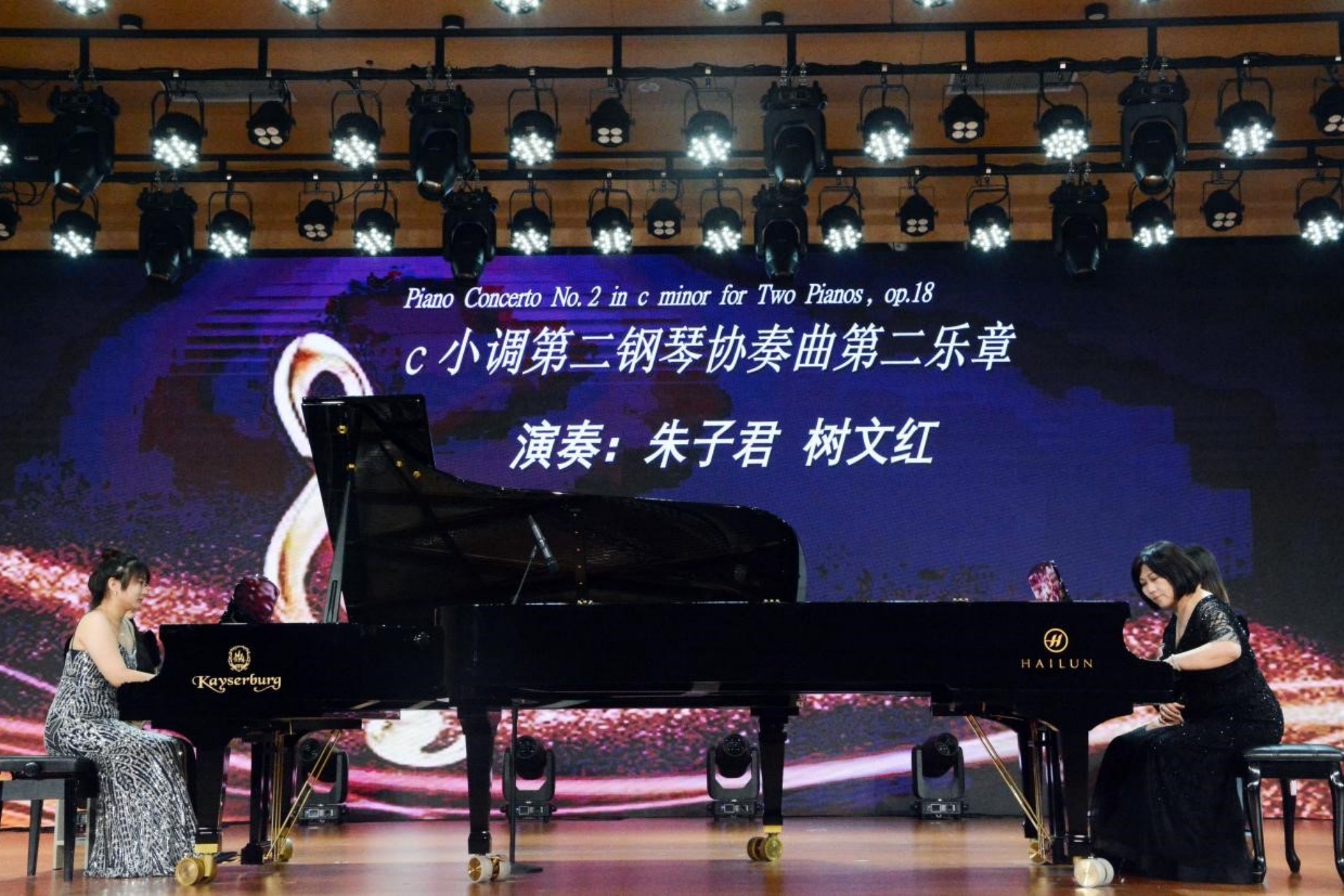音乐会在朱子君、树文红两位新老教师携手演绎的双钢琴拉赫玛尼诺夫《c小调第二钢琴协奏曲》的美妙旋律中推向高潮,画上了圆满的句号。
